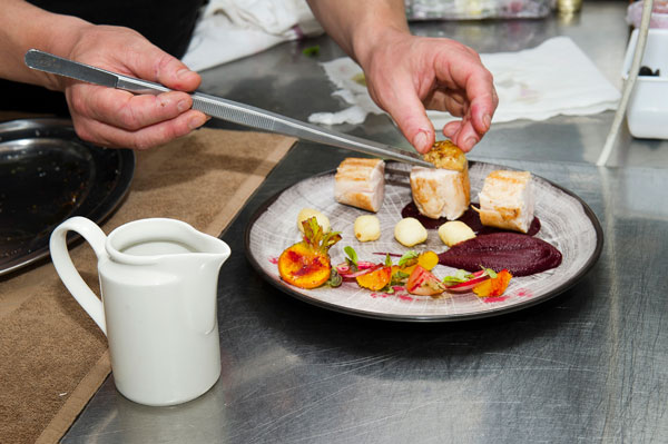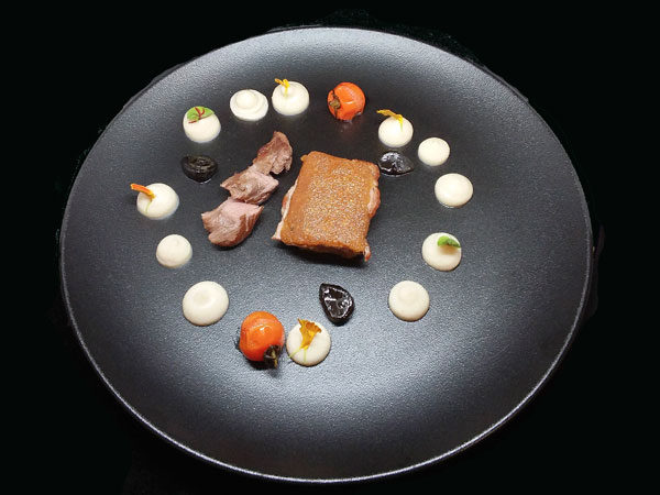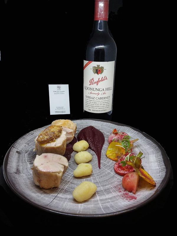 Suprême de Volaille Fermière au Poivre Noir de Madacascar et Foie Gras, Déclinaison Autour de la Betterave: une savoureuse volaille avec gnocchi juste poêlés, accompagné de betterave en carpaccio assaisonné d’huile d’olive, purée de betterave travaillé avec les chutes de betteraves, mini betterave jaune et pétale de betterave, accompagné d’une sauce porto.