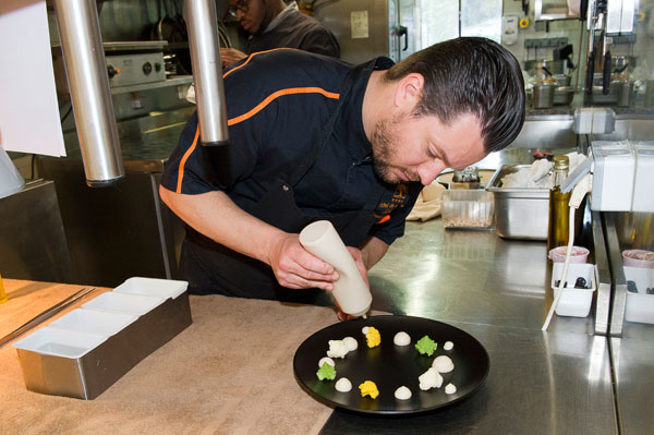 Lotte en Kadaif au Curry, Mousseline de Choux-fleur aux Noisettes: badigeonnée de curry et miel, la lotte est habillée de cheveux d’anges. En accompagnement: purée de choux fleur à la noisette et choux fleur romanesco vert, choux fleur jaune et blanc arrosé d’une sauce gingembre, coco et citronnelle, relevé avec un peu de raz el hanout.