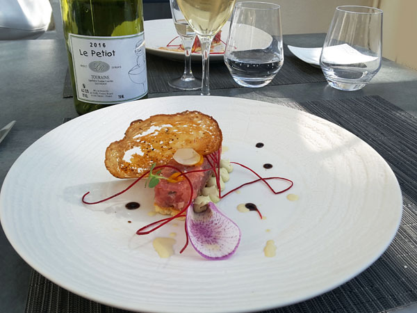 La fraîcheur du tartare de thon et le corsé du chorizo s’adoucit dans le guacamole. Une symphonie de couleur et de goût qui nous rappelle que l’été méditerranéen s’étire langoureusement jusque dans notre assiette, faisant de l’ombre à l’automne qui commence. Ce plat était accompagné d’un Sauvignon blanc de Touraine Le Petiot – 2016.