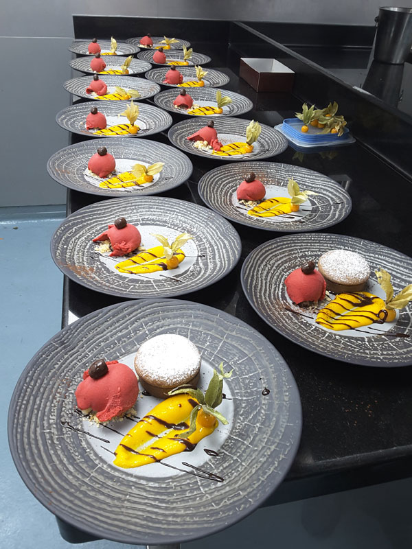 Tartelette Chocolat Cœur Mandarine, Sorbet Framboise et Coulis Mandarine.