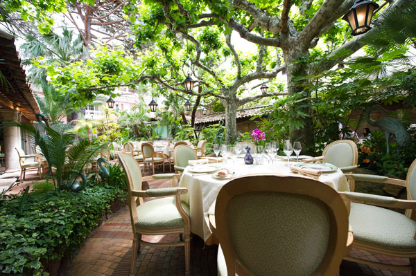 L’été, le patio luxuriant à la végétation exotique composé de majestueux platanes, de palmiers, de fontaines, de colonnes en pierre et de fleurs, accueille les belles tables drapées de nappes blanche pour les déjeuners ou diners.