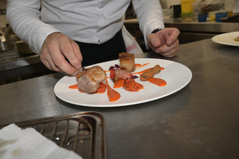 Jérôme clavel présente le Porc Ibérique, Gnocchi Olives, Basilique, Coulis de Poivrons Rouge et de son Jus Court ©YesICannes.com