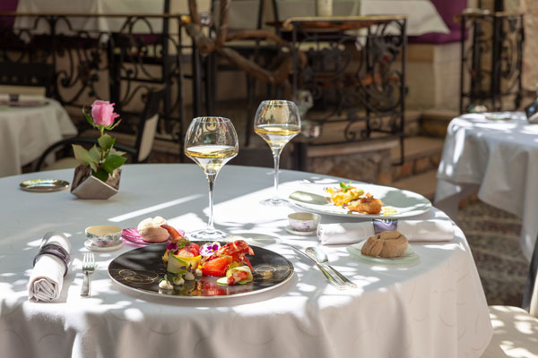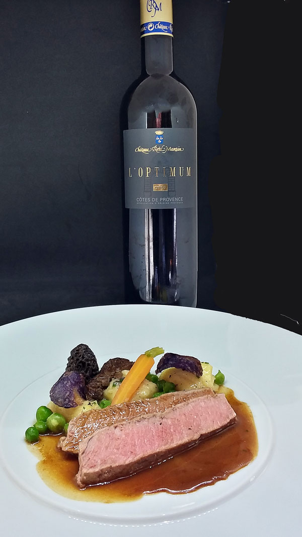 Selle d’Agneau des Alpilles, cuite en terre d’argile de Vallauris, Gnocchi aux Truffes « Tuber Mélanosporum », Légumes de saison, Jus à la Fleur de Thym (75 €). La chair rosé à point, fondante et parfumée, s’arrose d’un jus corsé, conjugué à la douceur de la terre, apportée par les légumes.