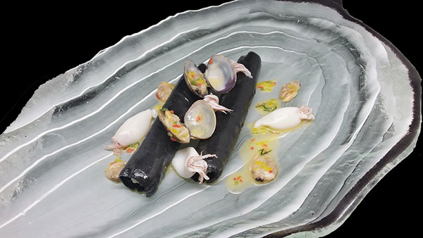Cannelloni de Supions et Palourdes à l’Encre de Seiche, Jus de Coquillages aux Feuilles de Basilic (58 €). Le velours satiné du cannelloni renferme des trésors marins de goûts iodés et de textures, une île de délices entourée d’une mer de jus de coquillages qui donne toute sa dimension au plat.