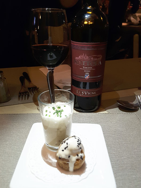 Le repas a débuté par un Cappucino aux Senteurs des Bois, Espuma à la Truffe et Focaccia, accompagné de sa Profiterole au Parmesan.