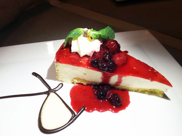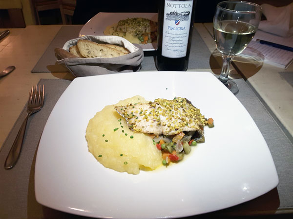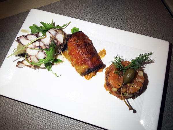 Dans l’assiette Mare e Monte, une Voltine d’Aubergines roulées autour de Parmesan, traçait une délicieuse frontière tiède entre le Carpaccio de Poulpe sur son rocher d’Écrasé de Pommes de Terre et le Tartare de Saumon couronné d’un fruit de Câprier et d’Aneth. Une explosion de nouvelles saveurs à chaque bouchée!