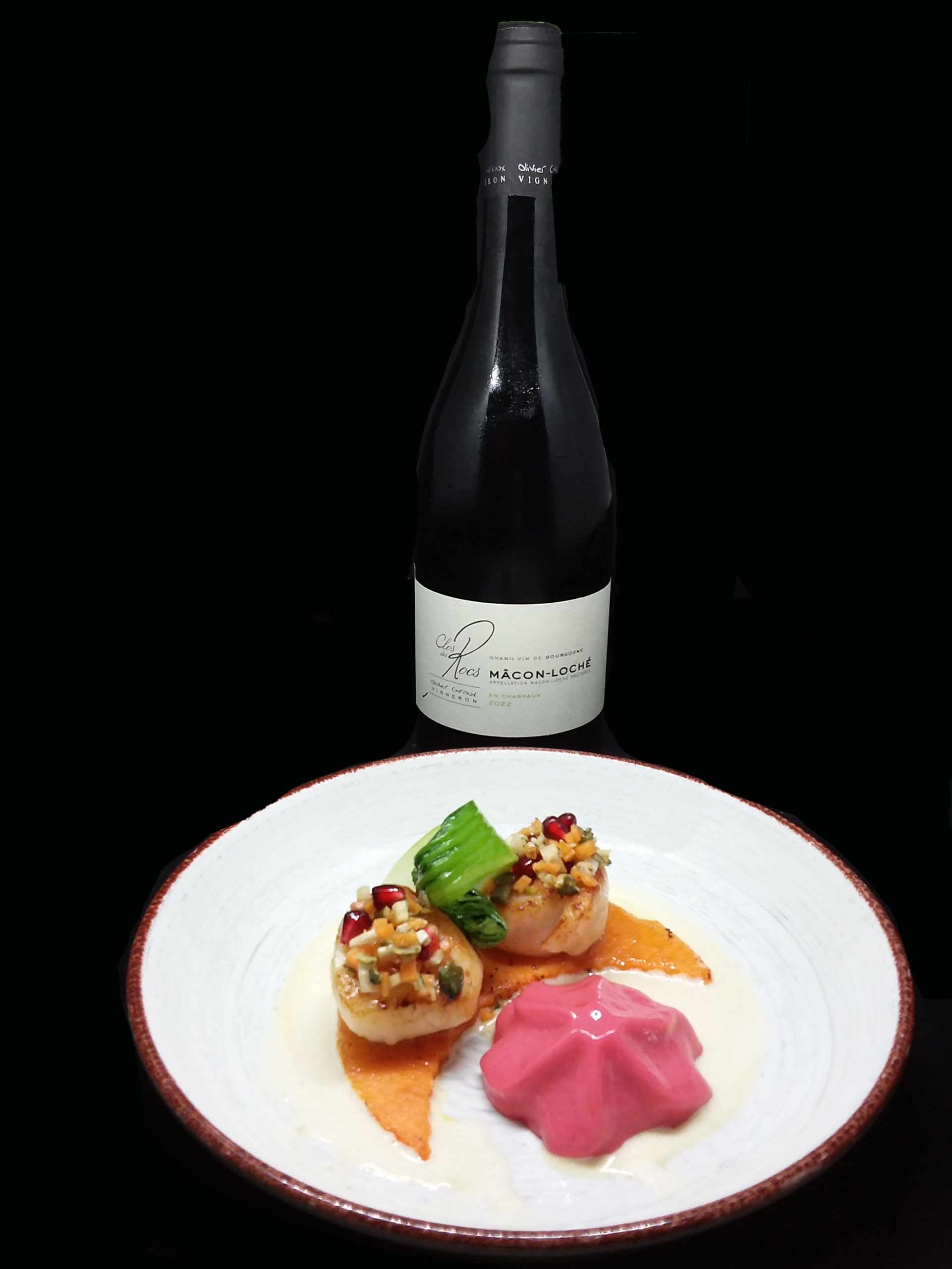 Noix de Saint-Jacques de la baie de Morlaix rôties, Courge au Poivre de Timut, Graines de Courge, Radis noir, Grenade, Coriandre fraîche, Citron vert, Espuma de Grenade, nage à la Fleur d’Oranger ©YesICannes.com