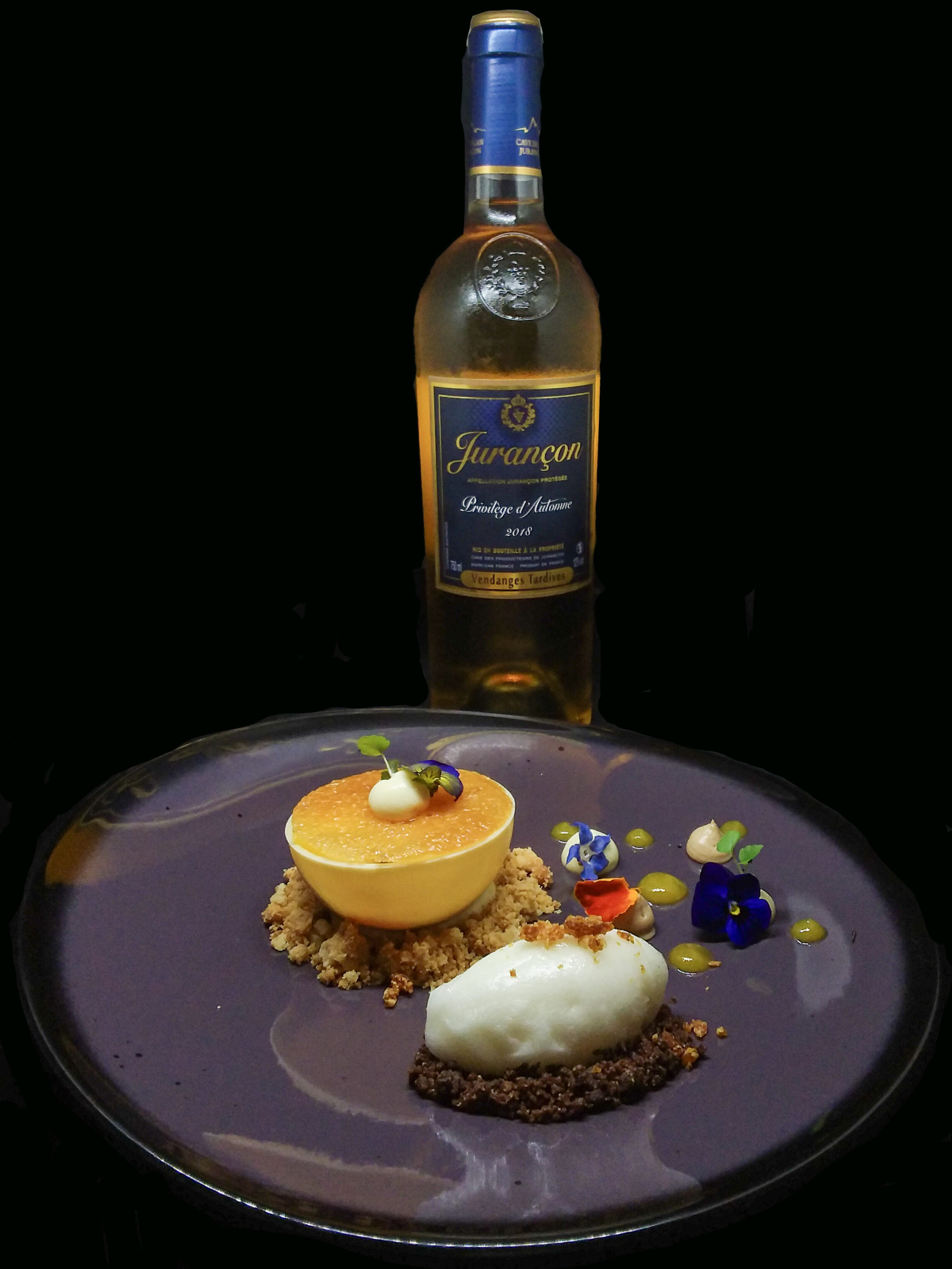 Solstis ivoire à l’Orange et Clémentine, Crumble aux Noix, Noisettes et Estragon, Tuile aux Agrumes, Ganache montée Mandarine et Cointreau, croustillant et crème Praliné Noisette, Marmelade d’Orange amère, Sorbet Bergamote ©YesICannes.com