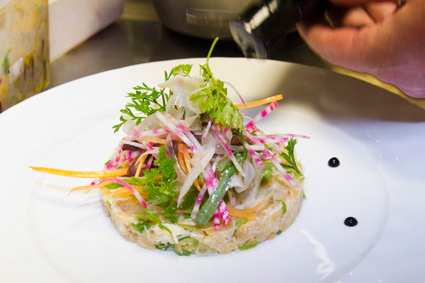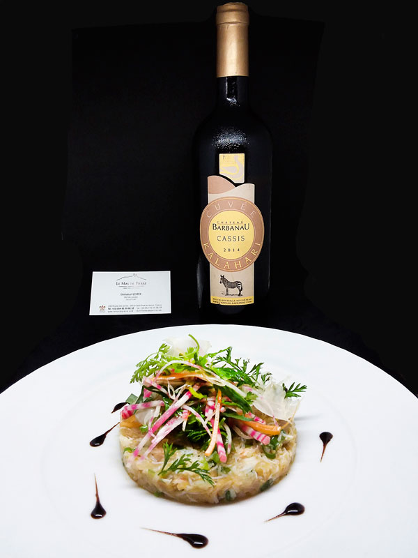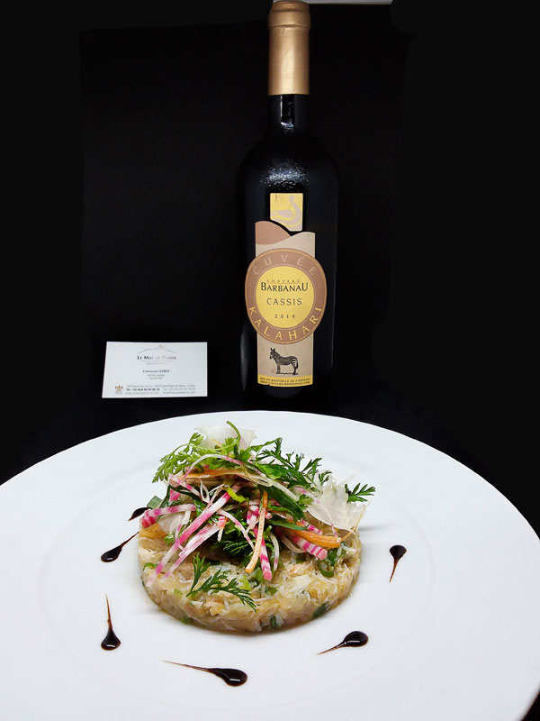Tartare de Daurade et Chair de Tourteau aux Oeufs Tobiko, Légumes Croquants: saveurs iodées se mariant à merveille avec l’aneth frais et aux petits légumes croquants: oignons frais, jeune pousse de carottes et de betteraves. Une belle alliance de mer, de terre et de saveurs aromatique du Jardin des Saveurs. Suggestion de vin: Château Barbanau – cuvée Kalahari – Cassis 2014.