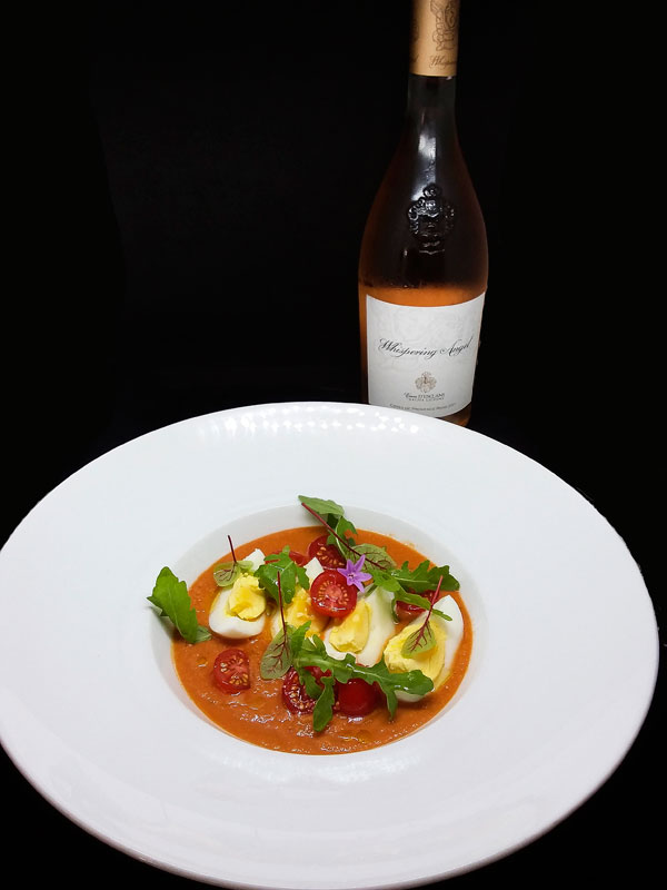 Le Gaspacho: Tomates de nos paysans, façon Salmojero. Frais, coloré, vitaminé, ensoleillé, léger et goûteux, toutes les saveurs méridionales dans l’assiette Explosion de goût et longueur en bouche, prolongée par la salade roquette et la douce puissance de l’huile d’olive, de Rémy Rouch à Saint Blaise, bien sûr! Suggestion de vin: Côtes de Provence – Whispering Angel Rosé 2017 – Château d’Esclans de Sacha Lichine.