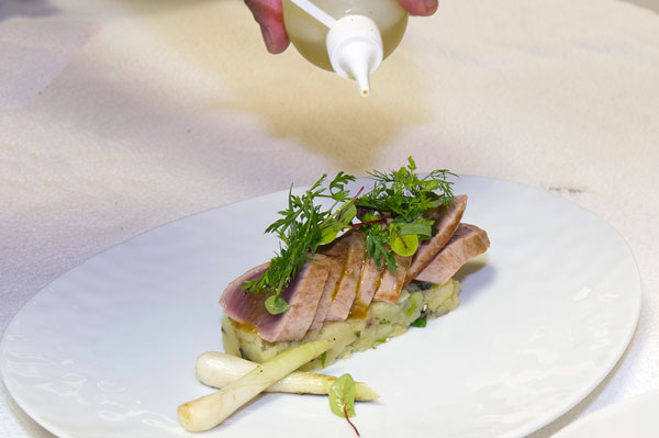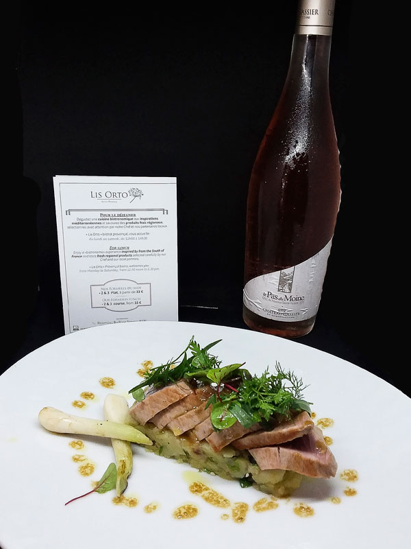 Pavé de Bonite à la Plancha, Ecrasé de pommes de terre aux Algues, Cébettes grillées et Sauce Vierge: chair fine et fondante, belles saveurs iodés, alliance heureuse de la mer et du potager. Haute en goûts aromatiques, la sauce vierge relève la chair délicate du poisson. L’huile d’olive de Rémy Rouch fait encore merveille! Suggestion de vin: Côtes de Provence rosé – Château Gassier – Le Pas du Moine.