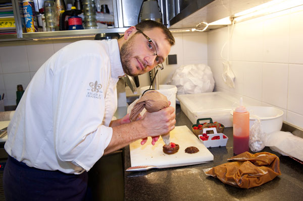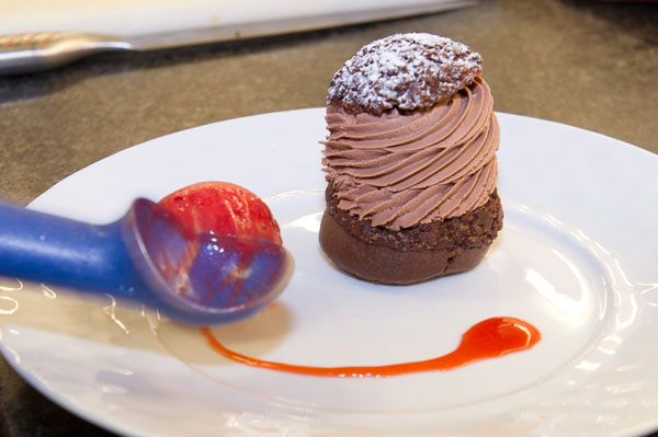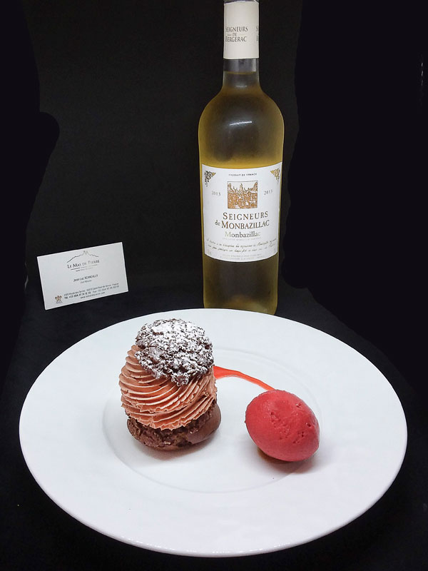 Choux Chocolat Bio, Caramel et Sorbet Framboise. Suggestion de vin: Blanc Seigneur de Monbazillac – Cuvée 2013.