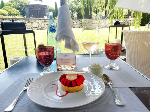 Avec ces produits frais d’excellence, le chef Emmanuel Lehrer créé une carte aux saveurs méditerranéennes, renouvelée tous les quinze jours, avec une suggestion du jour selon l’arrivage du marché et du Potager de Pierre, où le jardinier cultive avec amour les légumes frais mis à l’ardoise. Dans un environnement fleuri et boisé aux parfums subtils de Provence, le chef met en assiette la devise Goûtez aux belles choses de la vie. Sa carte propose de trois entrées, trois plats (dont un végétarien) et trois desserts, avec, invitation à la fraîcheur en ces périodes de chaleurs, les glaces et sorbets « fait maison » signés du chef Pâtissier-Glacier Jean-Luc Kenneally.