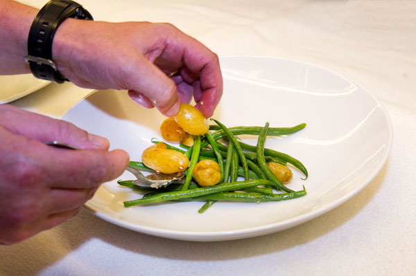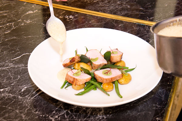 Noix de Veau, Haricots Verts et Délicatesse Confites: une viande rosée, tendre à coeur, des haricots verts croquants, des pommes de terre rate fondantes, couronnées de feuilles de sauge grillées et parfumées au soleil du midi, le tout nappé d’une onctueuse émulsion. Suggestion de vin: Château Reillanne – Rosé Cuvée Héritage 1189.