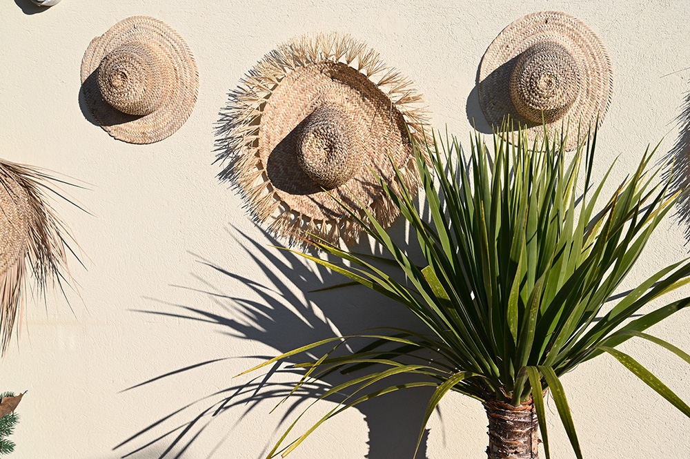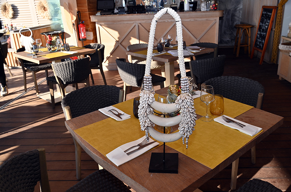 Sur la longue plage de sable blanc, dans une atmosphère naturelle et chaleureuse, en symbiose avec son environnement, Mademoiselle Gray affiche ses courbes harmonieuses, ses proportions parfaites et son élégance absolue sans aucun complexe. La structure de ses éléments de bois clair se fond harmonieusement avec sa parure hivernale qui mêle avec raffinement et poésie le bleu de la méditerranée, le bleu azur du ciel du sud et la blancheur des massifs de l’Estérel. Dans ce décor de carte postale, l’ambiance zen parsemée de touches végétales et chamarrées de couleurs éclatantes, apporte au lieu un sentiment d’évasion, de quiétude et de douceur. Une belle collection de chapeaux de paille, de colliers en coquillage, de plumes, de fleurs et de raphia, complètent l’esprit bohème de Mademoiselle Gray.