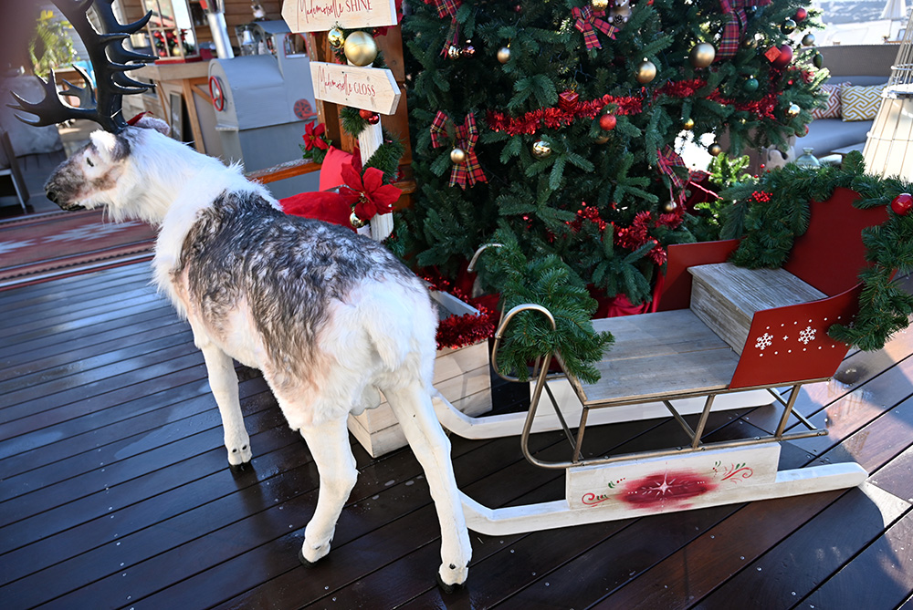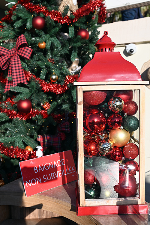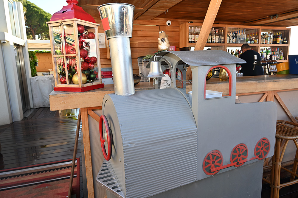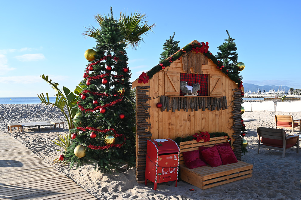 A votre arrivée dans ce paradis féérique, Mademoiselle Gray fera voyager votre imagination en vous transportant dans son univers illuminé et rayonnant. En premier lieu vous découvrirez avec surprise que des sapins enguirlandés ont poussés sur le sable cannois et qu’un chalet alpin a pris place près des élégants transats. Mais ce n’est pas tout, car le clou de ce spectacle à ciel ouvert est une drôle de locomotive dont la chaudière crache des flocons de neige et des marrons grillés accompagnées de vin chaud. A l’entrée de la plage et pour couronner le tout, un superbe trône, tout de rouge vêtu, accueille chaque après-midi un père Noël jovial et souriant. A ses côtés, un magnifique traîneau et un renne grandeur nature complètent ce ravissant tableau pictural.