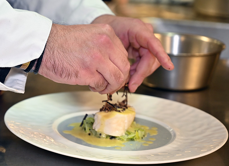 Le Magnifique Dos de Cabillaud poché aux aromates sur son poireau au zeste de citron et truffe, jus de fenouil à la truffe