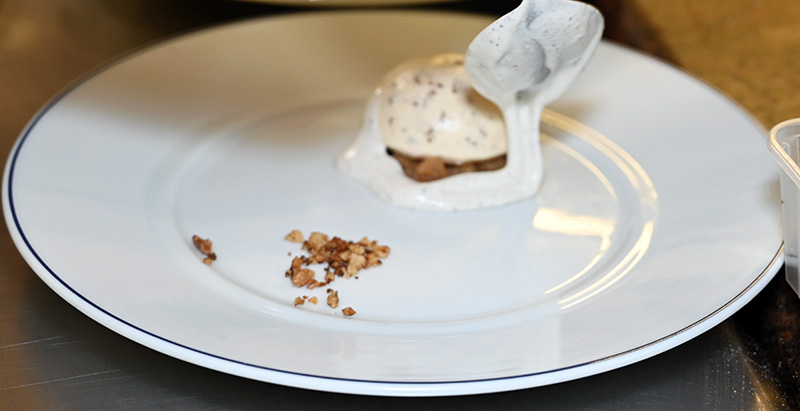 La douceur de noix sur sa compotée de pomme rôtie à l’huile de noix, sauce chocolat blanc à la truffe, glace caramel