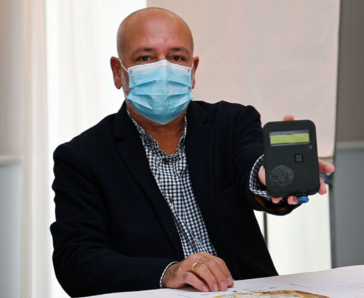 Michel Santinelli présente le boîtier déterminant les potentiels hydriques ©YesICannes.com