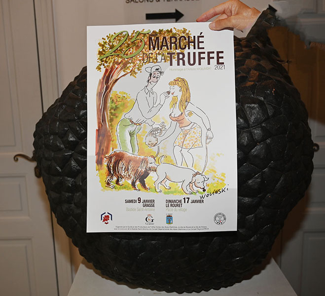 L’affiche du 25ème Marché de la Truffe est un hommage à Georges Wolinski, une des victimes de l’attentat de Charlie Hebdo assassinées le 7 janvier 2015 par la barbarie islamiste. En 1961, le dessinateur de presse rejoint Cavanna, Reiser, Cabu et le « Professeur Choron » pour former l’équipe de Hara-Kiri, « journal bête et méchant », au ton à la fois cynique, grivois et provocateur. Dans les années 80, il collabore à L’Humanité, Libération, Le Nouvel Obs, Paris-Match, Le Point et toujours Hara-Kiri, qui deviendra Charlie Hebdo. En 2003, après avoir « cavé » avec les rabassiers du département, il signe l’affiche du 7ème Marché de la Truffe par une œuvre exaltant la sensualité du mystérieux champignon. Le Syndicat des Trufficulteurs des Truffes Noires des Alpes maritimes ont tenu à lui rendre hommage en remettant à l’honneur son savoureux dessin.