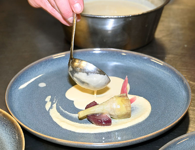 Le loup doré aux cébettes et passion, jus de feuille d’artichaut à l’huile et oignon doux