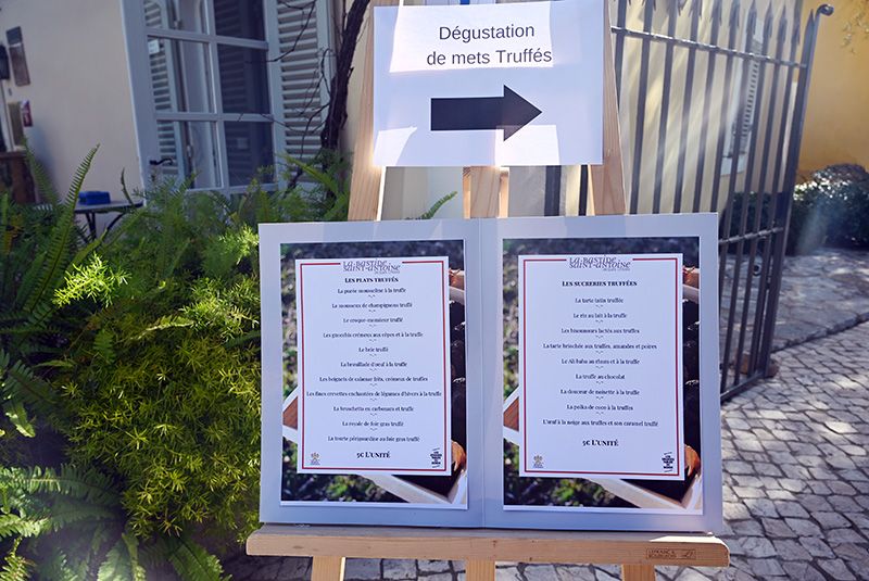 Mis en appétit par le parfum des truffes, les gastronomes ont pu combler une petite faim en dégustant sous le chaud soleil baignant les jardins de la Bastide les délices truffés concoctés par le chef Laurent Barberot et la brigade de Jacques Chibois: La Purée Mousseline à la Truffe, le Mousseux de Champignons Truffé, les Gnocchis crémeux aux cèpes et à la Truffe, le Brie Crémeux, la Brouillade d’Oeuf à la Truffe, les Beignets de Calamar frits, crémeux de Truffes, les Fines Crevettes enchantées de légumes d’hiver à la Truffe, la Bruschetta en Carbonara et Truffe, la Royale de Foie Gras Truffé, la Tourte Périgourdine au foie gras Truffé (5 euros).