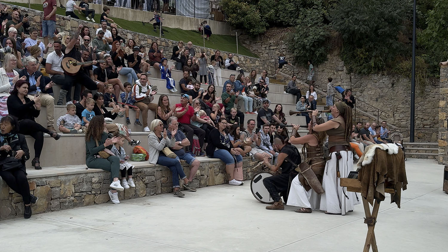 Citons aussi les troupes musicales : les Sonagli di Tagatam venus d’Italie, la Compagnie Viodofnir, musiciens-chamanes et maîtres du Feu Nordique qui, en soirée d’ouverture des Médiévales de Callas a donné un magnifique spectacle de feu, et les musiciens de Rhésus à l’énergie incroyable, venus de Metz. Le samedi soir, c’est un spectacle son et lumière par La Porte des Étoiles qui a enchanté les gradins remplis d’un public enthousiaste. En après-midi, les habiles épéistes de la Compagnia del Leone italienne et les redoutables guerriers médiévaux de l’Host des Temps Jadis se sont livré à d’épiques et haletants combats. Tous ont rivalisé de talent pour faire vibrer l’âme médiévale de Callas!