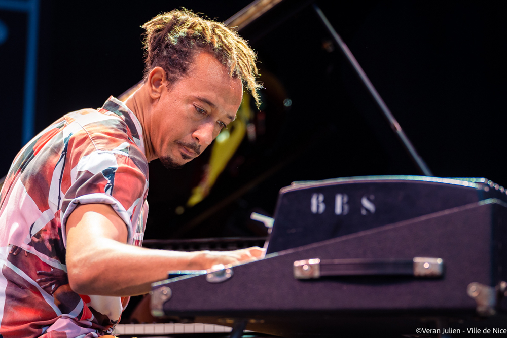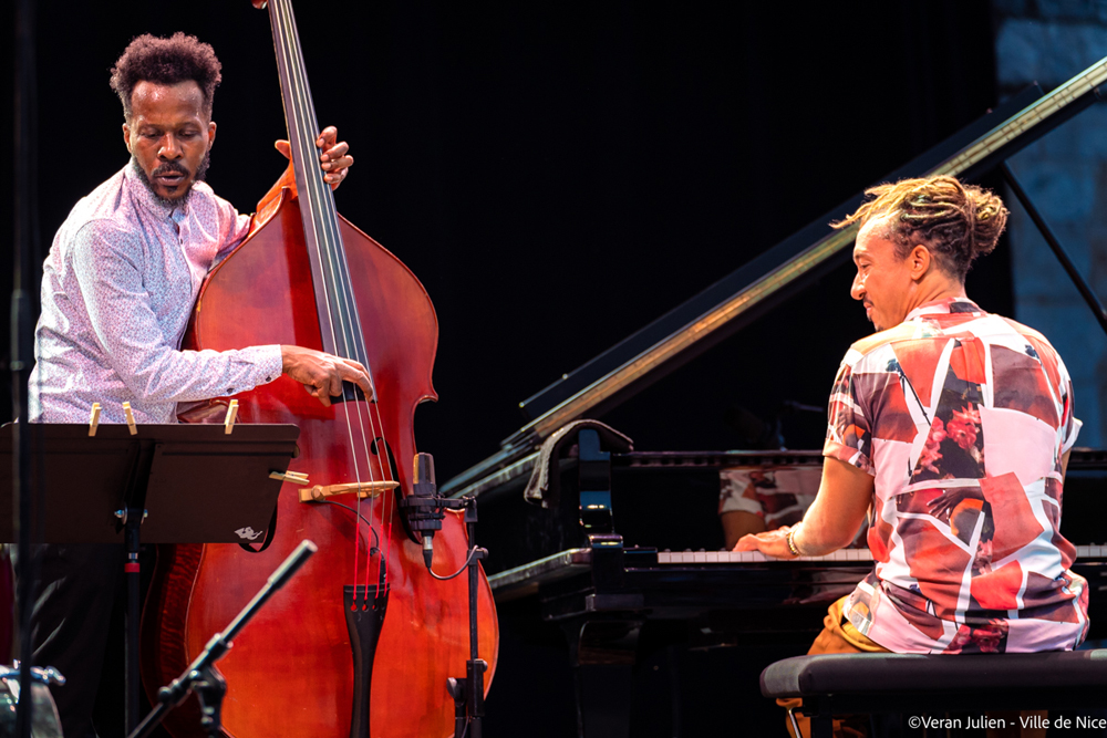 Place ensuite à Gerald Clayton. Ce pianiste et compositeur américain, nommé à six reprises aux Grammy Awards, incarne la vitalité renouvelée du jazz. Ce virtuose et improvisateur reconnu qui déploie avec classe et finesse ses sonorités dynamiques, a fait fleurir au Théâtre de Verdure sa vision de l’esthétisme. Après la sortie de Happening : Live at the Village Vanguard, l’artiste est revenu avec Bells On Sand, son deuxième album pour Blue Note Records. Cette œuvre jazzy explore l’impact et l’abstraction du temps à travers onze titres en osmose avec son mentor Charles Lloyd au saxophone, le père John Clayton à la basse, l’ami de longue date Justin Brown à la batterie, et le nouveau collaborateur MARO au chant. Sa musique palpable, tangible et voluptueuse, sa sensibilité mélodique doté d’un charisme imposant, flirta avec une puissante et complexe légèreté. Dans les gradins, l’interactivité et la complexité abordable des arrangements déclencha parmi le public de mélomane un swing déhanché indissociable à la formule.