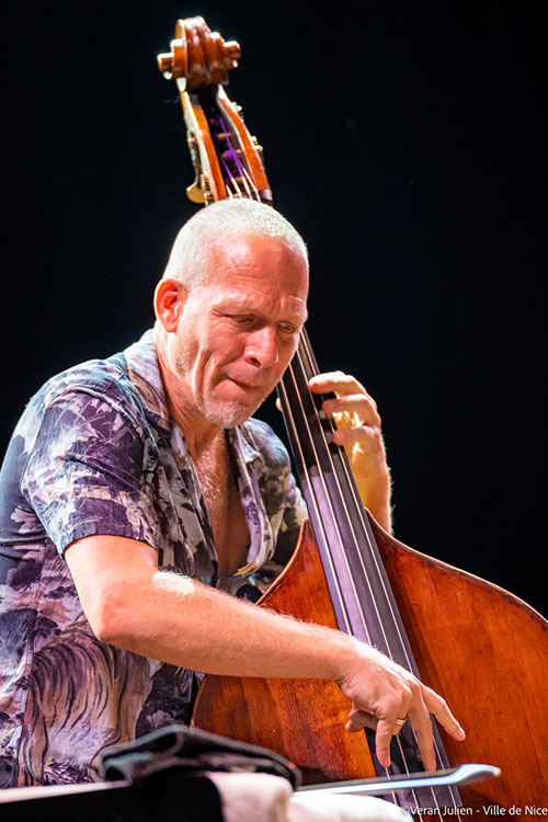 Pour clore cette soirée placée sous les meilleurs auspices, Avishai Cohen se révéla l’élément indispensable pour parfaire cette programmation de haut vol. Né en Israël, l’auteur, compositeur, chanteur, est l’un des contrebassistes les plus connus de la scène jazz. De retour au Théâtre de Verdure, Avishai Cohen est venu en trio présenter son dernier album Shiftings Sands (Naïve/Believe), qui fait suite à celui de Twi Roses sorti il y a quelques mois. Accompagné du pianiste Elchin Shirinov et de la jeune Roni Kaspi à la batterie, le virtuose renoue avec l’alchimie propre de sa musique: élégance musicale, grandes lignes mélodiques et rythmes divers et recherchés. Au sommet de son génie créatif, son swing unique et nonchalant, ce véritable monstre de la musique qui peut se révéler diabolique signe avec ce nouvel album, une forme de retour aux sources qui met l’accent sur le rythme, le groove et la transe.