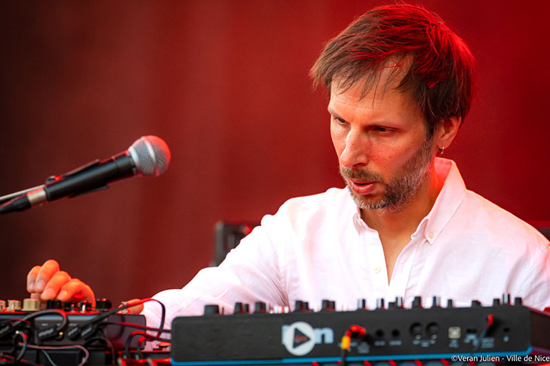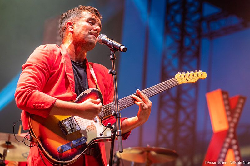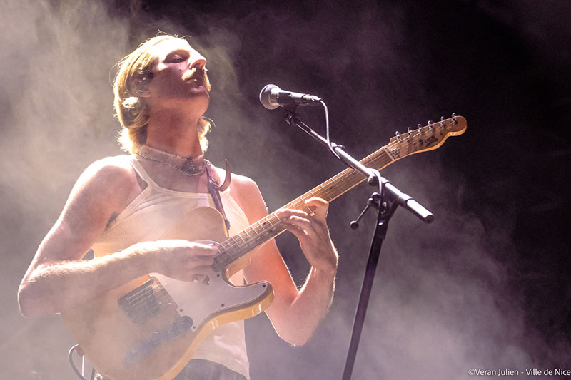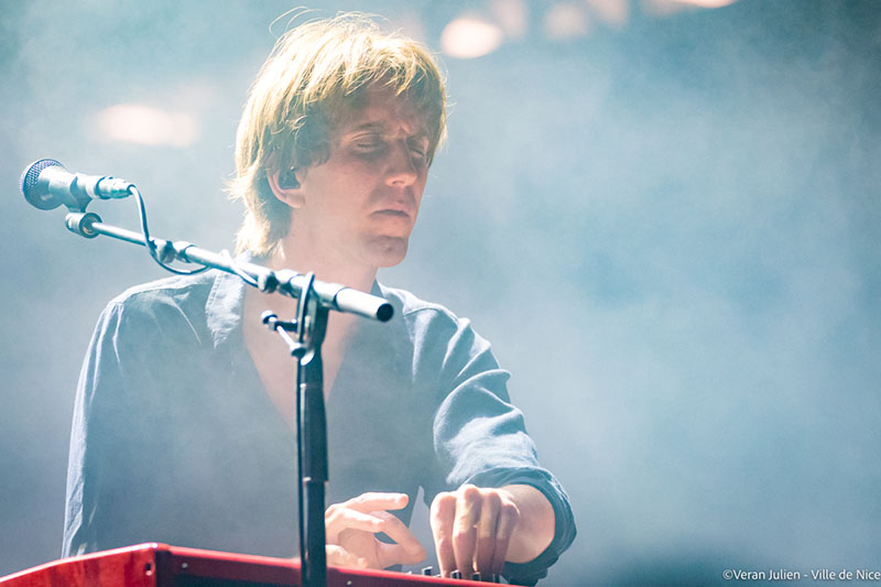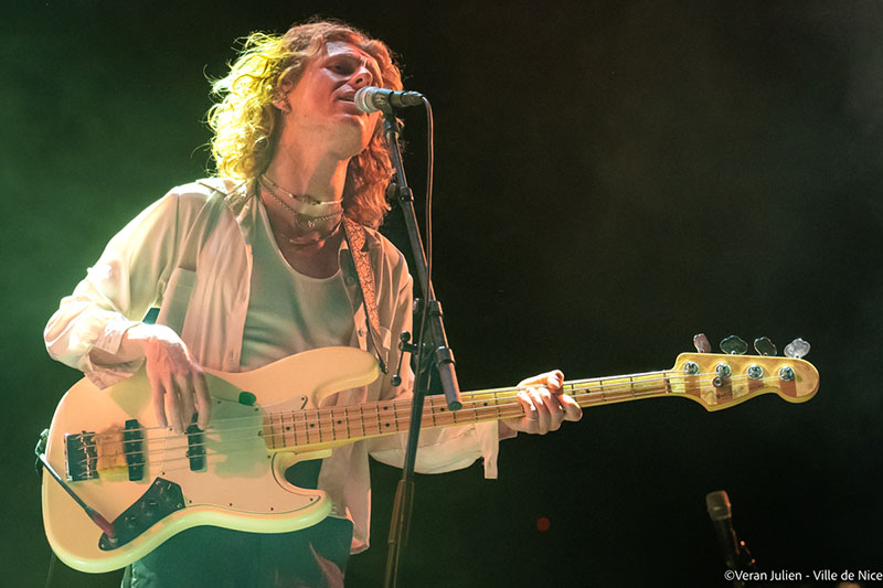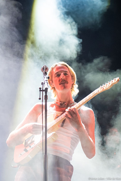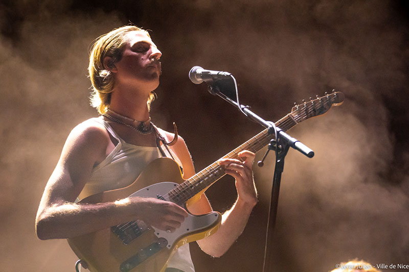 Après ce déluge musicale flamboyant, la scène a changé de couleurs et de rythmes avec le groupe Parcels. Originaire de Byron Bay, le haut lieu du surf australien, ce quintet aux cheveux longs et vêtements à la cool, au refrains dansants et accrocheurs, ont balayés tout les clichés musicaux. Composé de Patrick Hetherington (clavier/guitariste); Noah Hill (bassiste); Anatole Serret (batteur); Louis Swain (clavier) et Jules Crommelin (guitariste), le groupe aux allures tout droit sorties d’une carte postale est venu poser ses valises et ses instruments à Nice, pour le plus grand plaisir de leurs fans impatients de savourer les morceaux de leur deuxième album Day/Night. Tout en interprétant leurs titres ensoleillés et en souriant sans interruption, leur joie de vivre s’est exprimée non seulement dans leur musique, traits d’union entre électro, pop et disco, mais aussi dans leurs looks bariolés, leurs harmonies vocales haut perchées et leurs folies capillaires. Multipliant les clins d’œil aux Seventies, leur effervescence saupoudrée d’insouciance et dé-sophistication ont fait vibrer la foule jusque tard dans la nuit grâce à leur Groove implacable.