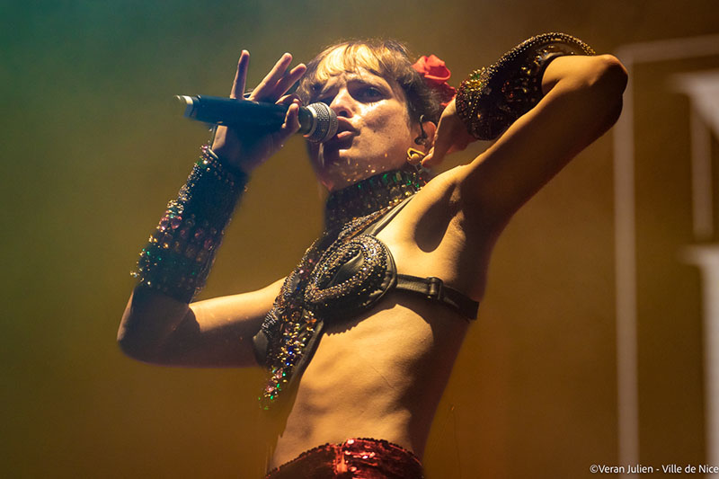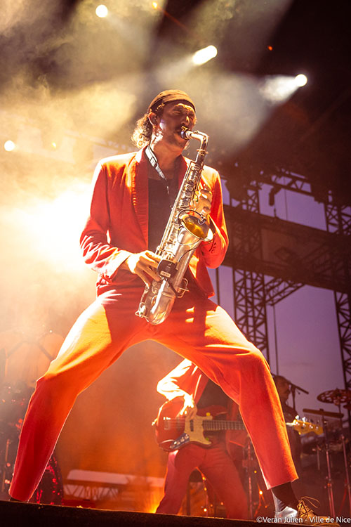 Après cette détonation fulgurante de cuivre place aux costumes déjantés, colorés, brillants et à la scénographie éblouissante de la formation Deluxe. Grâce à leur énergie communicative et leurs titres entraînants, Kilo, Katia (en top argenté, mini jupe rouge et tennis assortis), Pietre, Soubri, Pépé et Lilboy, tous arborant des tenues exotiques orangées, ont déployé sur la scène Massena une explosivité et un dynamisme qui ont fait remuer en cadence tous les popotins massés sur la pelouse. En interprétant les titres de leur quatrième album sorti en 2022, Moustache Gracias, le sextuor à la moustache nous a offert un nouvel opus plein de gravité avec la chanson Flowers. Entre sonorités cuivrées, rythmes latino, intimité jazzy, funk «slappé» à la Bruno Mars, ce « melting potes » qui font chauffer les scènes du monde entier et qui ont déjà assuré plus de cinq-cents dates en France ((Francofolies, Printemps de Bourges, Solidays, Montreux Jazz Festival, Vieilles Charrues…), nous ont démontré ici à Nice leur immense talent à communier avec leurs fans à chacun de leur passage sur scène, en l’occurrence la Scène Massena (public accroupi, sautant ou bras levé).
