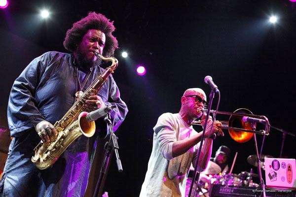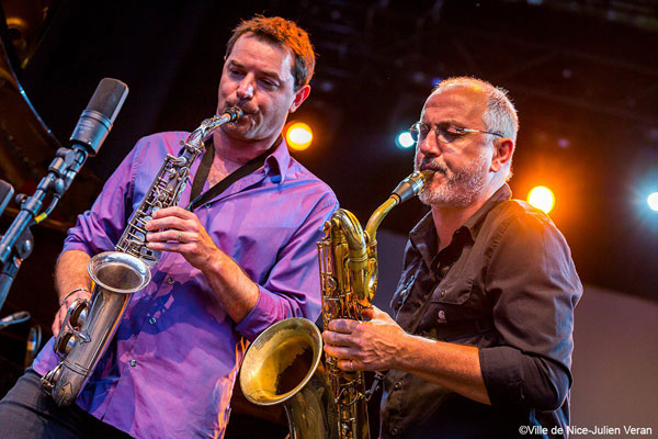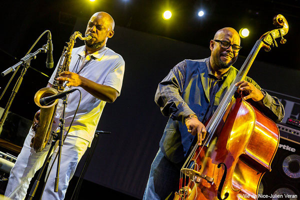 De l’autre côté, sur la scène du Théâtre de Verdure, le grand vainqueur du Tremplin Nice Jazz Festival 2015, le groupe Spirale Trio interpréta son jazz mélodique et actuel. Place ensuite au saxophoniste ténor et contrebassiste Henry Texier et à ses Sky Dancers 6 interprétant une musique passionnante, riche et complexe, avec des envolées lyriques des cuivres et de la guitare. La musique dédiée aux Indiens d’Amérique du Nord et du Sud avec des titres comme Lakota ou Hopi fut une belle invitation au voyage. Enfin, il était temps d’écouter celui qui pour beaucoup restera la découverte majeure du festival 2017, le californien Kamasi Washington. Accompagné de son père Ricky Washington au saxophone soprano et à la flûte, le géant débonnaire arriva sur scène vêtu d’une grande tunique africaine. Dès le premier morceau, le Californien emporta le public dans un délire de sons puissants qui emportèrent tout sur leur passage. Enfin, le pianiste du groupe, Brandon Coleman exécuta un groove très funky au synthétiseur, appuyé par les frappes conjuguées des deux batteurs, et le jeu très rythmique du bassiste. Un concert tout simplement magique qui prouva la vigueur et le renouvellement éternel de la Great Black Music.