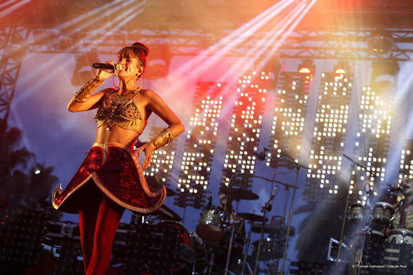 Sur la même scène, à 20h, le groupe Con Brio a déchaîné les foules. Le chanteur Ziek McCarter, tout de rouge vêtu, a enchaîné les titres funk et soul, tout en dansant et sautant sur scène. Ce septuor en provenance de San Francisco incarne l’un des plus beaux fleurons de la soul et sans aucun doute l’une des plus belles découvertes de cette édition. Puis ce fut au tour de Laura Mila de monter sur scène. D’emblée, elle séduisit les foules avec son charisme et sa voix puissante. Entourée de ses musiciens, elle a présenté son nouvel album aux accents hip-hop et aux influences électro et rock. Une réelle présence sur scène qui a conquis le public niçois.