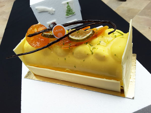 Serge le Hel (Aux Pains d’Autrefois à Mandelieu) avait réalisé sa Bûche Avelano: génoise, crème mousseline pralinée à l’ancienne, insert de meringue aux amandes.