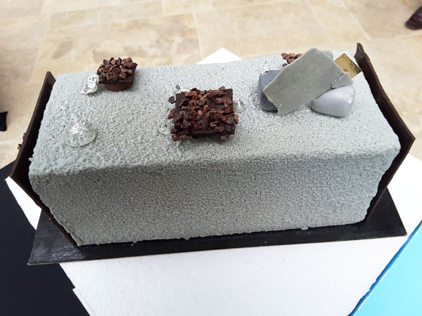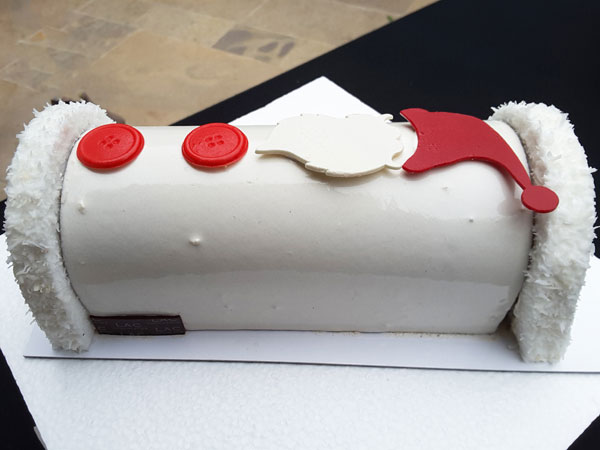 Décor rouleaux chocolat pour Marc Payeur de l’Hôtel Royal Riviera à St Jean Cap Ferrat: Mon Bo’sapin avec marron, mandarine, courge et fleur d’oranger. La bûche de Loïc Beziat de la Pâtisserie Canet à Nice & Cagnes sur Mer s’intitulait Ma lettre au Père Noël: croustillant noix de cajou, biscuit chocolat, ganache au poivre rouge, confit mangue banane passion, mousse chocolat 70%.