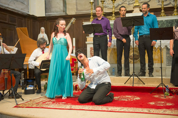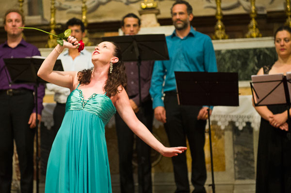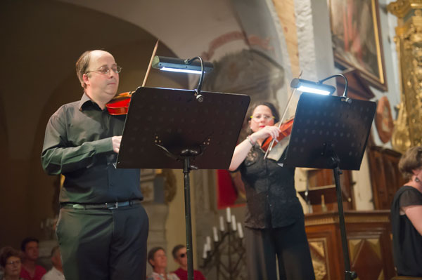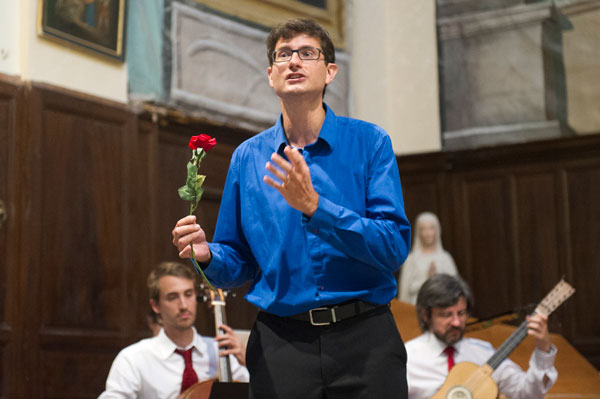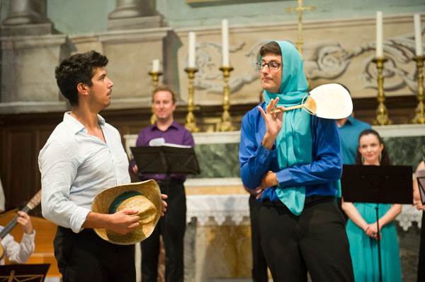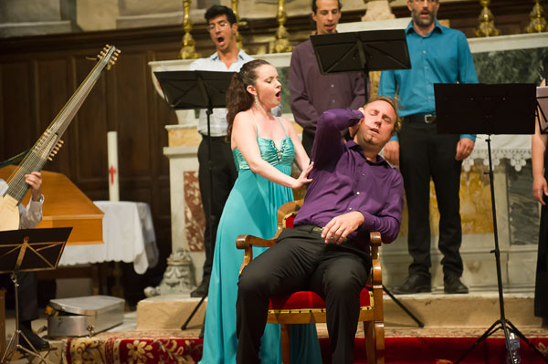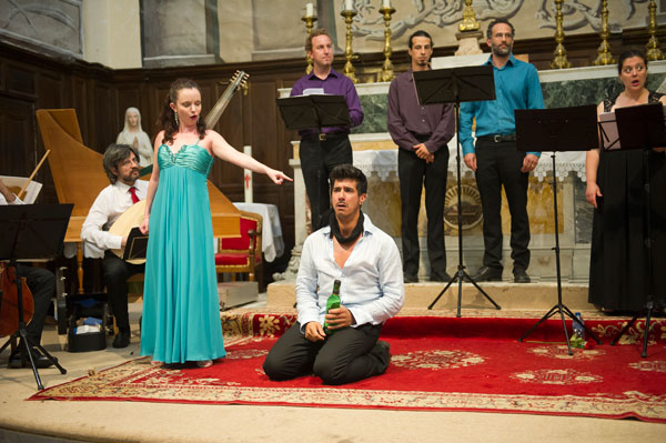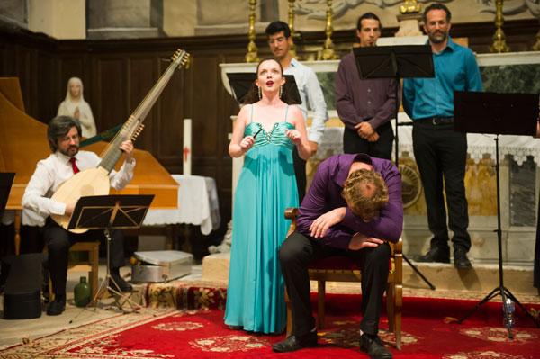 Le Mardi 23 juillet, c’est en l’Église Saint-Sylvestre de Claviers qui fut donné Il Canto Alla Viola Da Gamba de Claudio Monteverdi, le père de l’opéra. Le spectacle, interprété par l’Ensemble Comet Musicke comprenenant 4 musiciens dont 2 chanteurs, célébrait l’alliance de l’opéra avec le patrimoine, de l’art musical avec l’art architectural des lieux, servie par des musiciens talentueux, tour à tour récitants et chanteurs, s’exprimant en occupant tout l’espace de l’église, au milieu du public enchanté. Les musiciens ont illustré la vie mouvementée de Claudio Monteverdi par des œuvres crées à chacune des époques de sa vie.