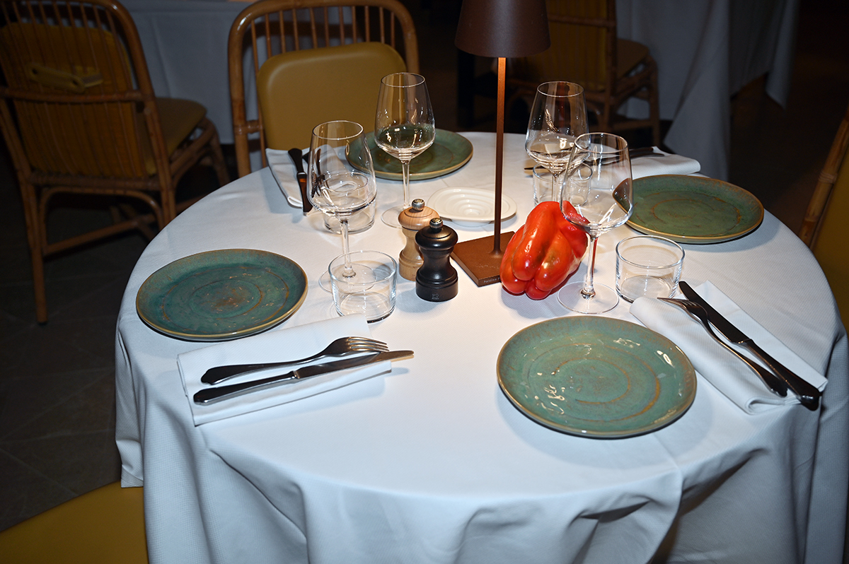 La décoration soigne les éclairages dans une ambiance élégante et chaleureuse: le plafond de la salle intérieure diffuse, sur les tables nappées de blanc, la douce lumière d’innombrables lustres en pâte de verre orange, tous différents et torsadés comme autant d’étoiles accueillantes et apaisantes en Berlingots de Carpentras. Sur chaque table – autour desquelles on s’assoie sur de belles chaises en rotin blond agrémentées de coussins – de mignons abat-jours haut perchés soulignent citrons, tomates ou poivrons en appétissants décors naturels.