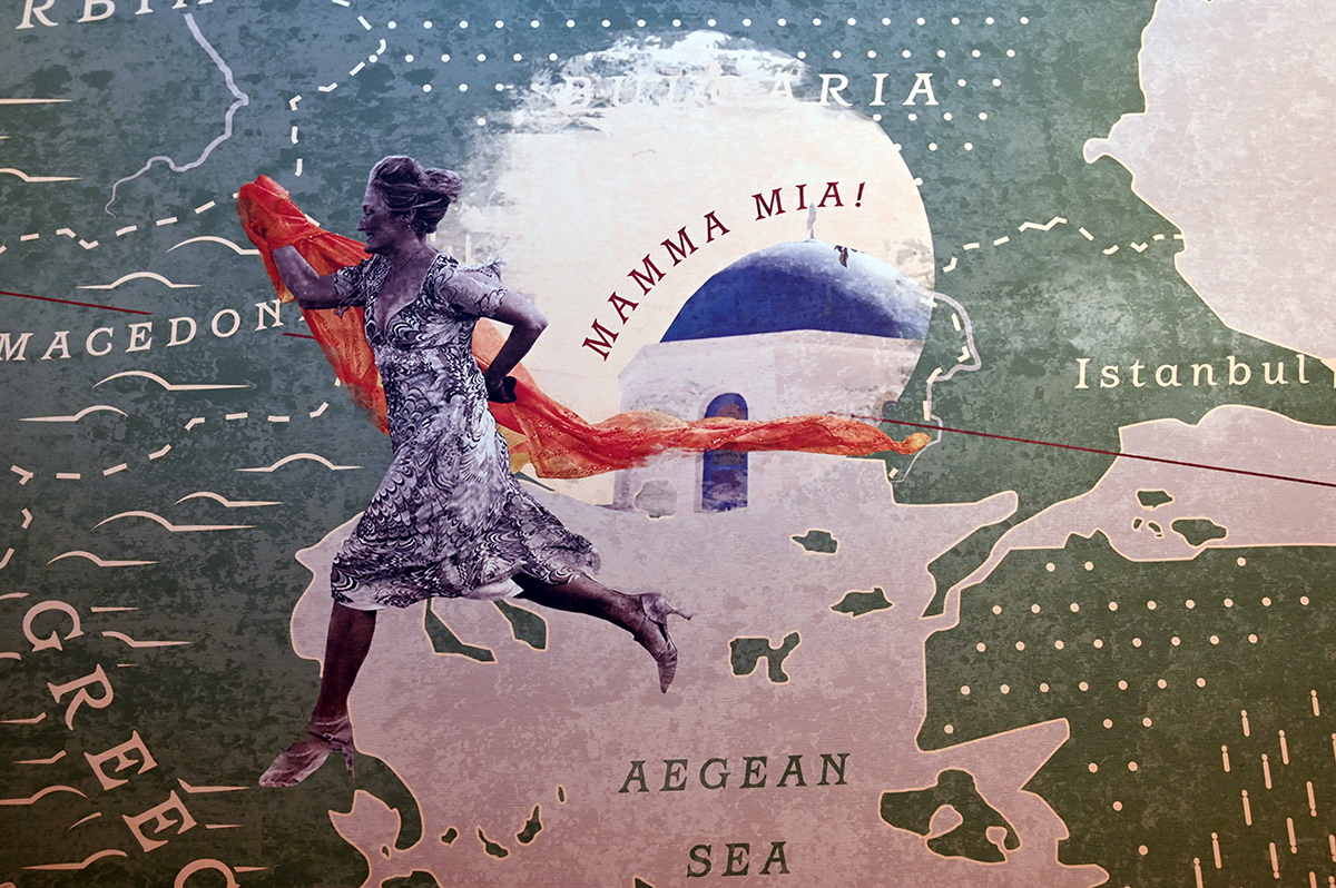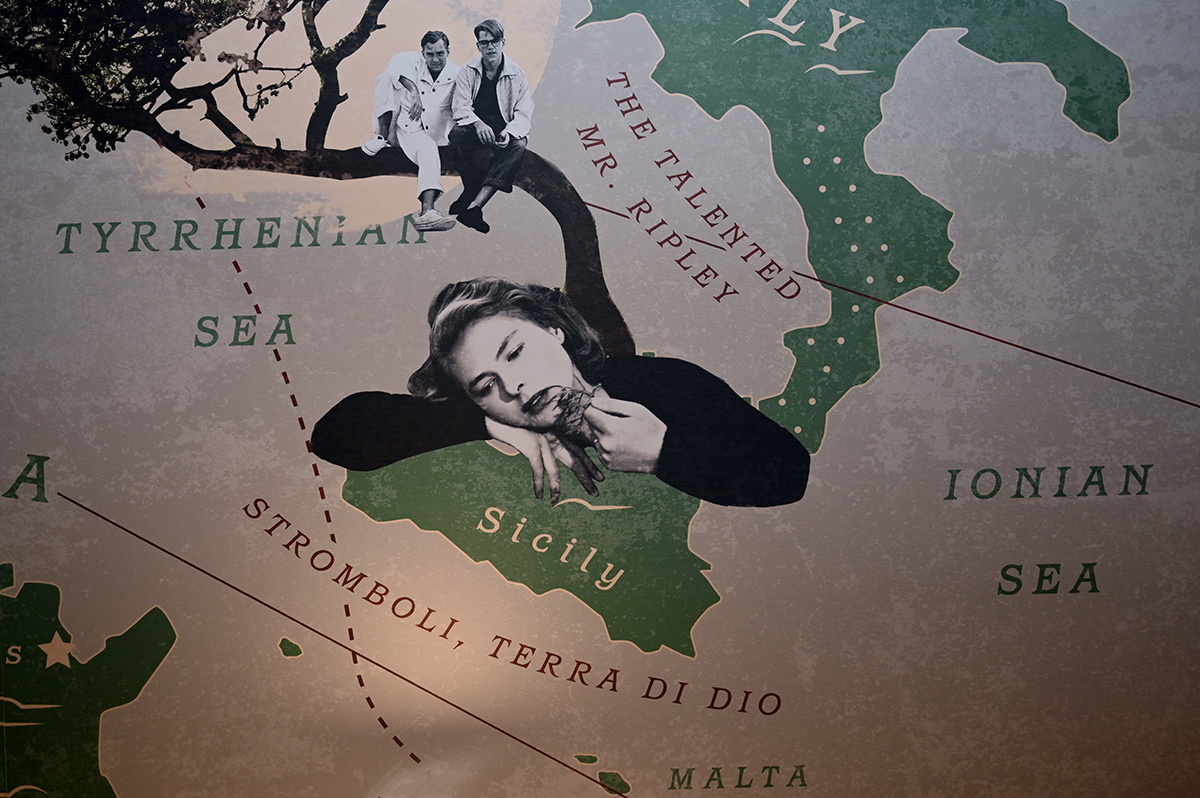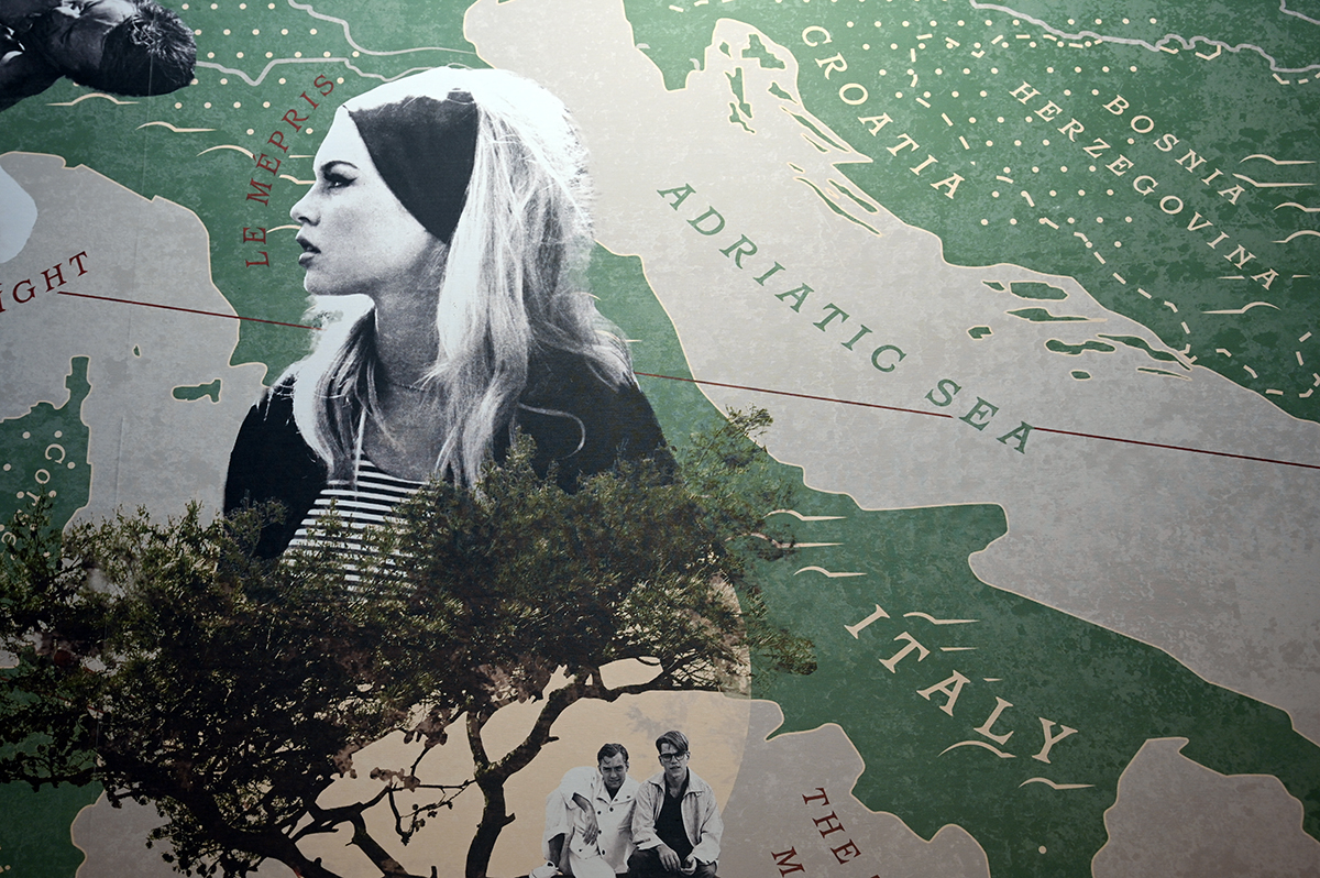 En toile de fond les irrésistibles Anthony Quinn et Irène Papas dans Zorba Le Grec, Cary Grant et Grace Kelly dans To Catch a Thief, (La Main au Collet), Jean Gabin et Mireille Balin dans Pépé le Moko, Matt Damon et Gwyneth Paltrow dans The Talented Mr Ripley (remake de Sous le Soleil avec Alain Delon), Lino Ventura et Charles Aznavour dans Un Taxi Pour Tobrouk, Roger Moore et Barbara Bach dans The Spy Who Loved Me…