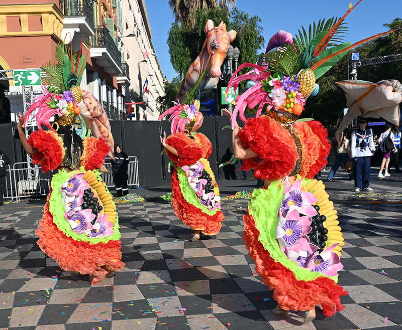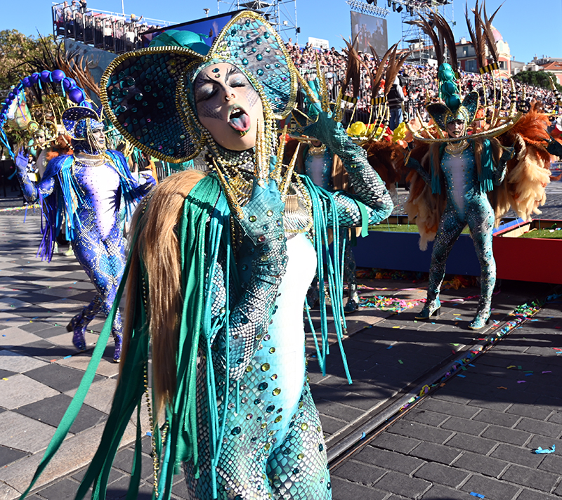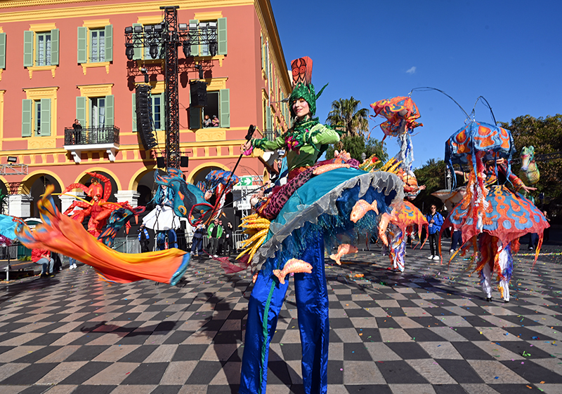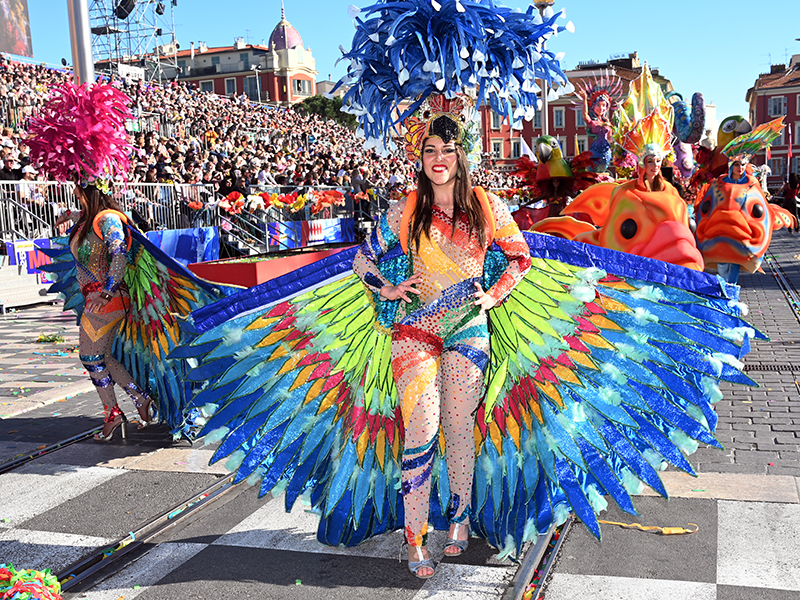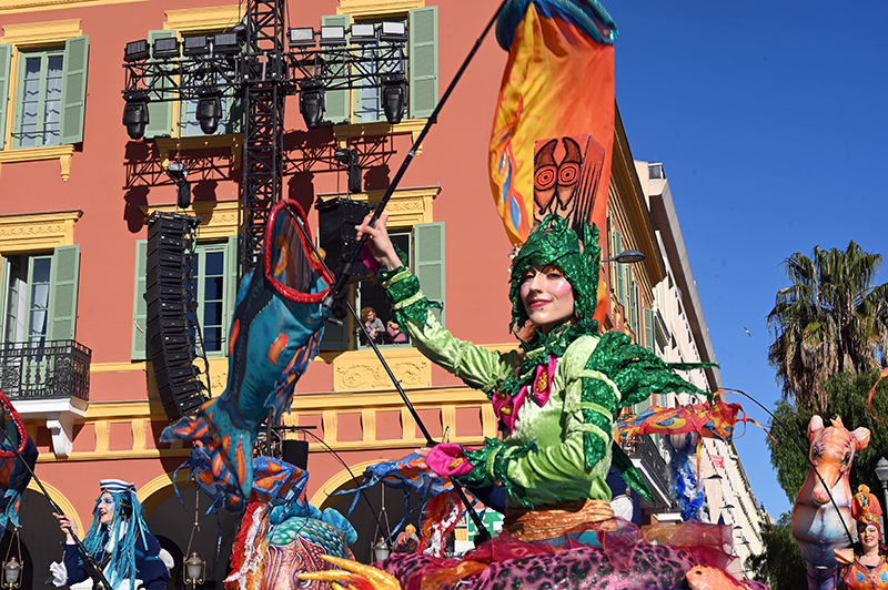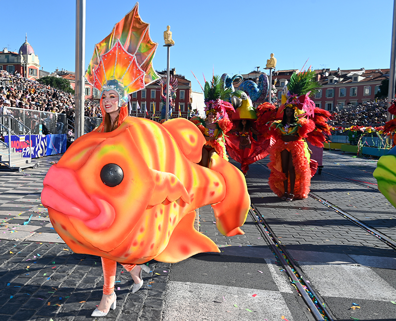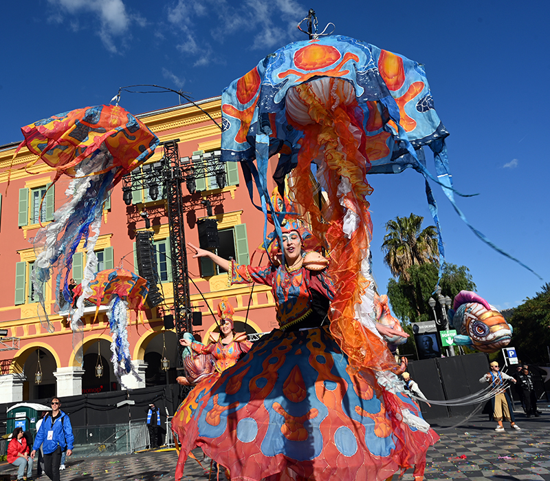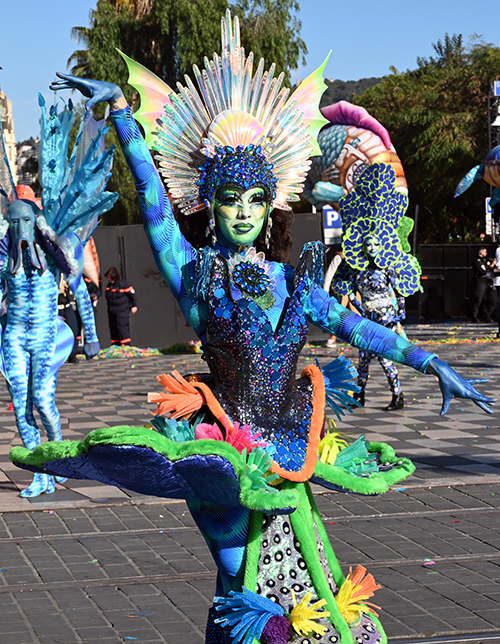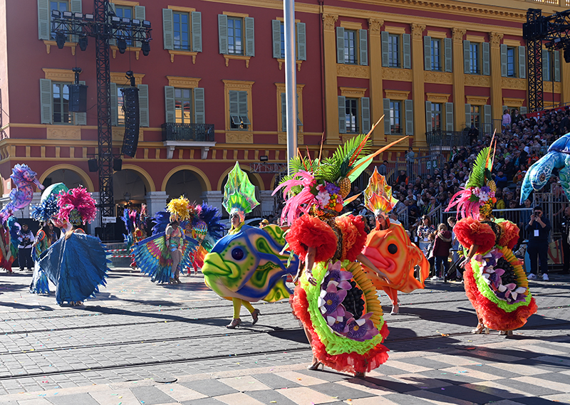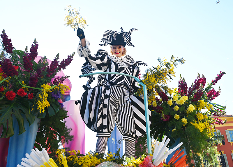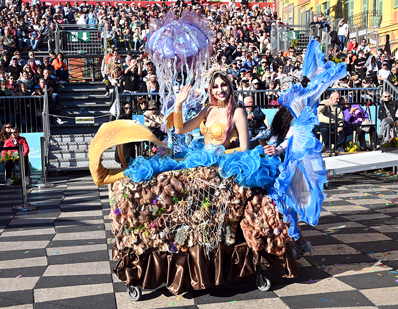 Bataille de fleurs : comme chaque année depuis un siècle et demi, au Carnaval de Nice, sa Majesté le Roi des Océans s’est emparé le 12 février des clés de la ville pour un règne éphémère qui durera jusqu’au 2 mars 2025. Chaque sortie du Monarque, entouré de sa Reine et de son Carnavalon, donne lieu à une déferlante de parades géantes de jour comme de nuit. Des chars volumineux et mécanisés, des costumes colorés, des grosses têtes, des musiciens, des danseurs, des acteurs de rue et les plus belles compositions florales des Bataille des Fleurs rentrent en piste pour faire le show.