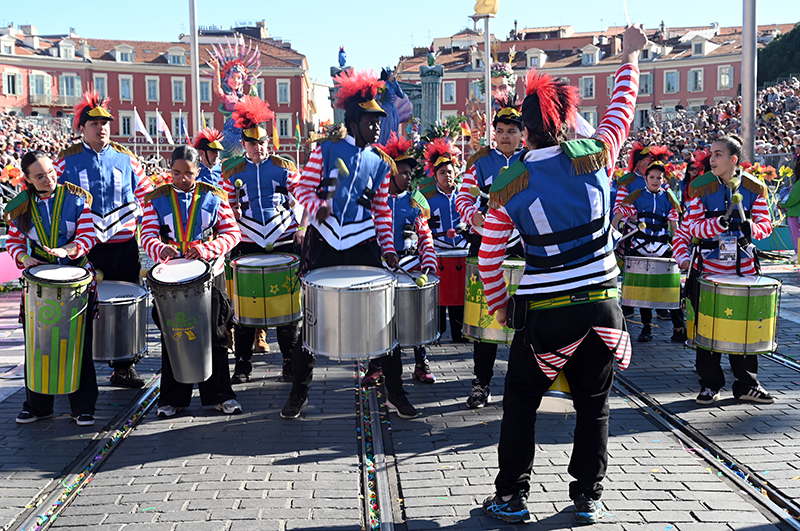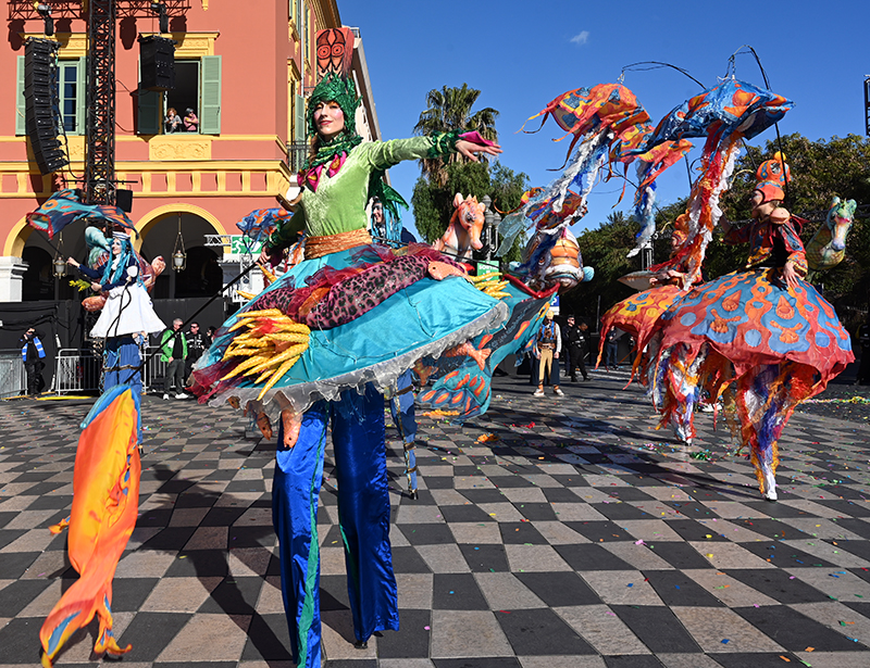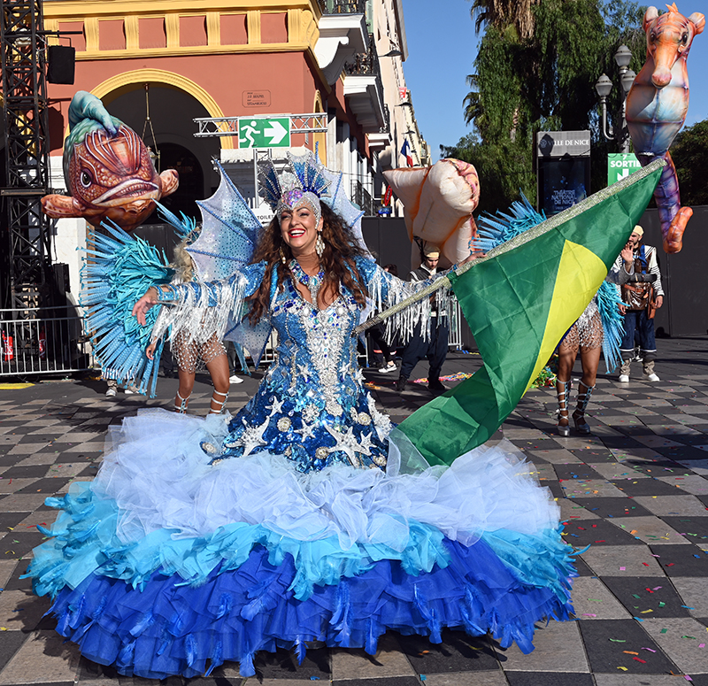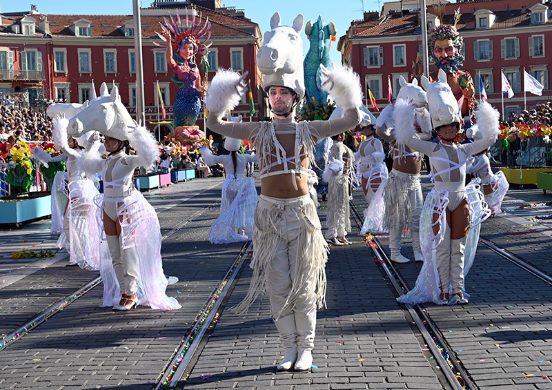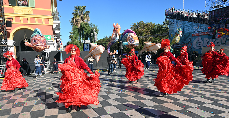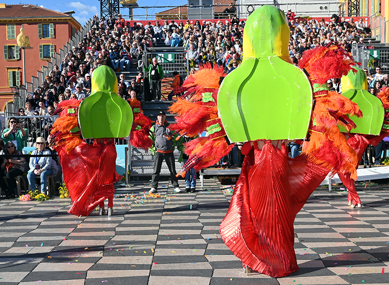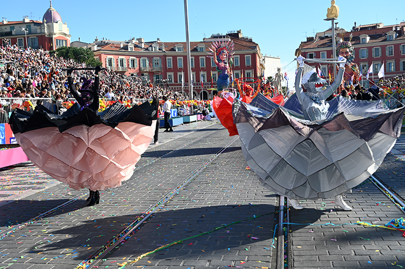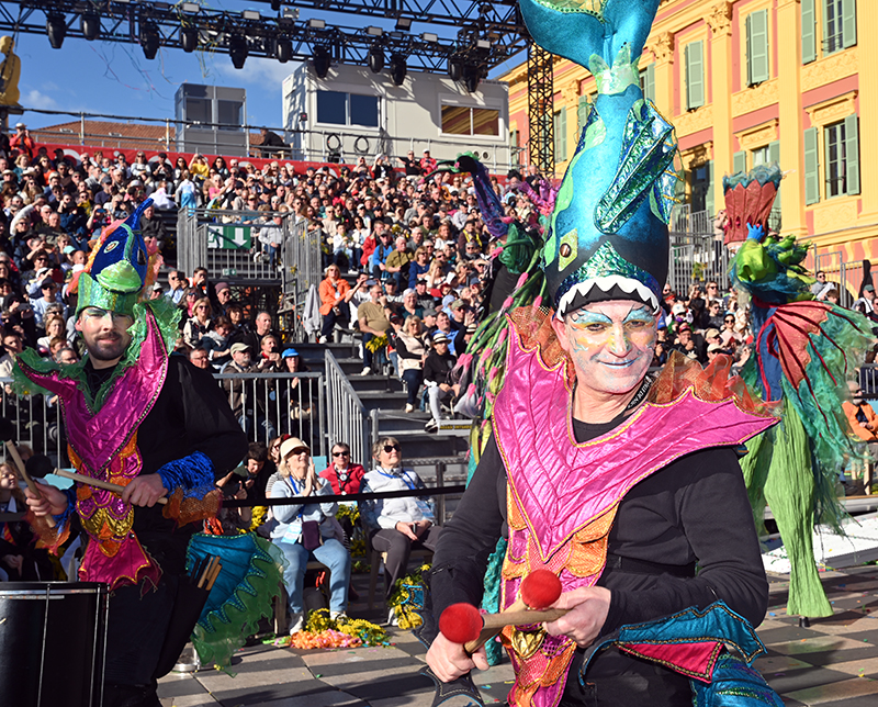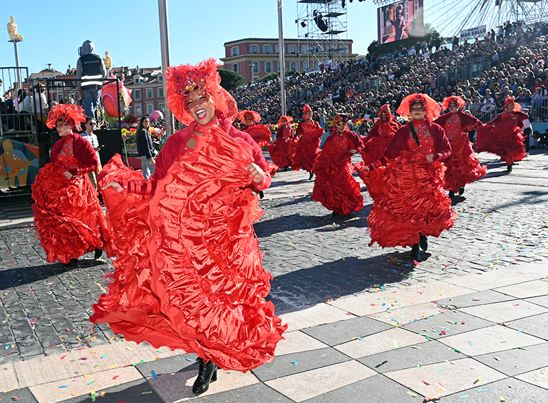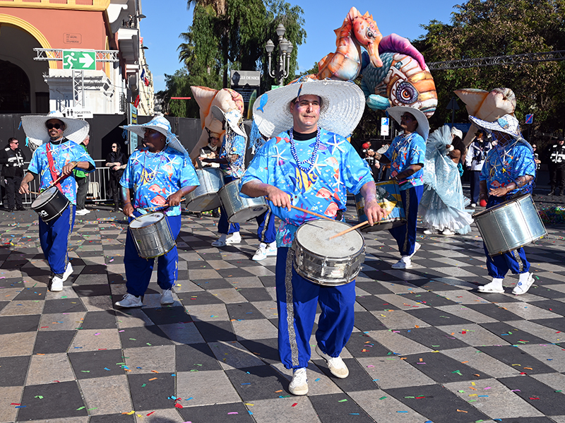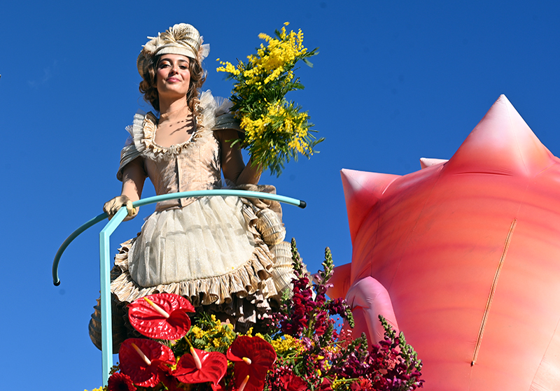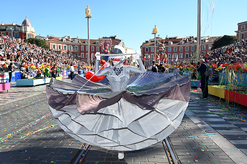 Bataille de fleurs : comme chaque année depuis un siècle et demi, au Carnaval de Nice, sa Majesté le Roi des Océans s’est emparé le 12 février des clés de la ville pour un règne éphémère qui durera jusqu’au 2 mars 2025. Chaque sortie du Monarque, entouré de sa Reine et de son Carnavalon, donne lieu à une déferlante de parades géantes de jour comme de nuit. Des chars volumineux et mécanisés, des costumes colorés, des grosses têtes, des musiciens, des danseurs, des acteurs de rue et les plus belles compositions florales des Bataille des Fleurs rentrent en piste pour faire le show.