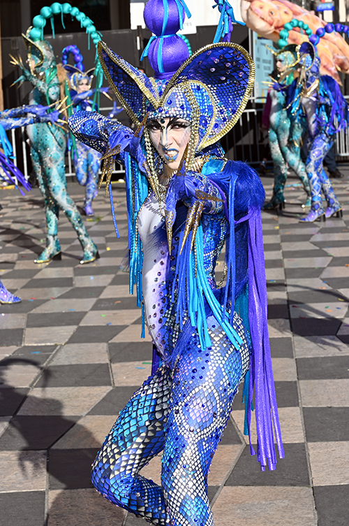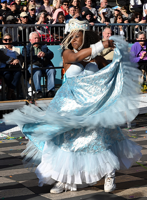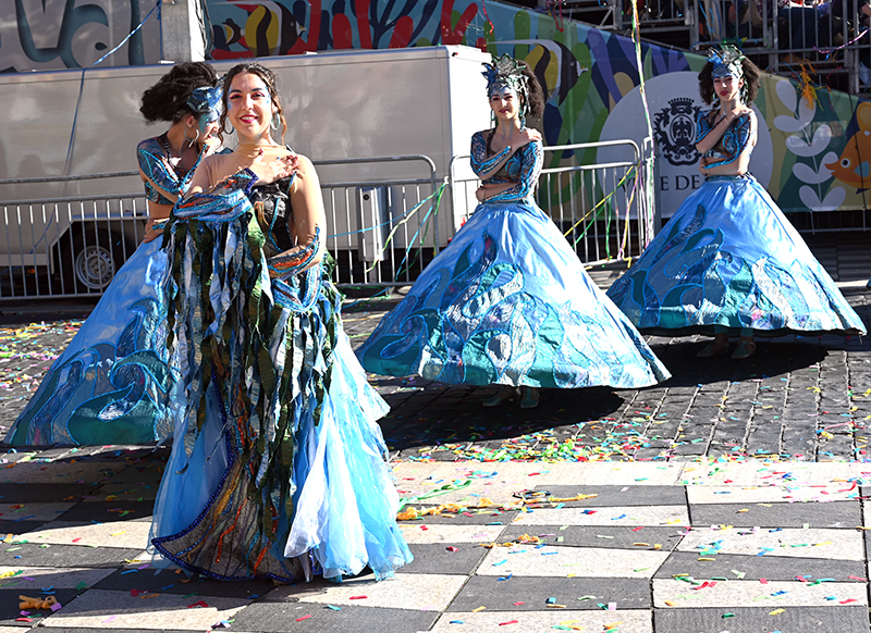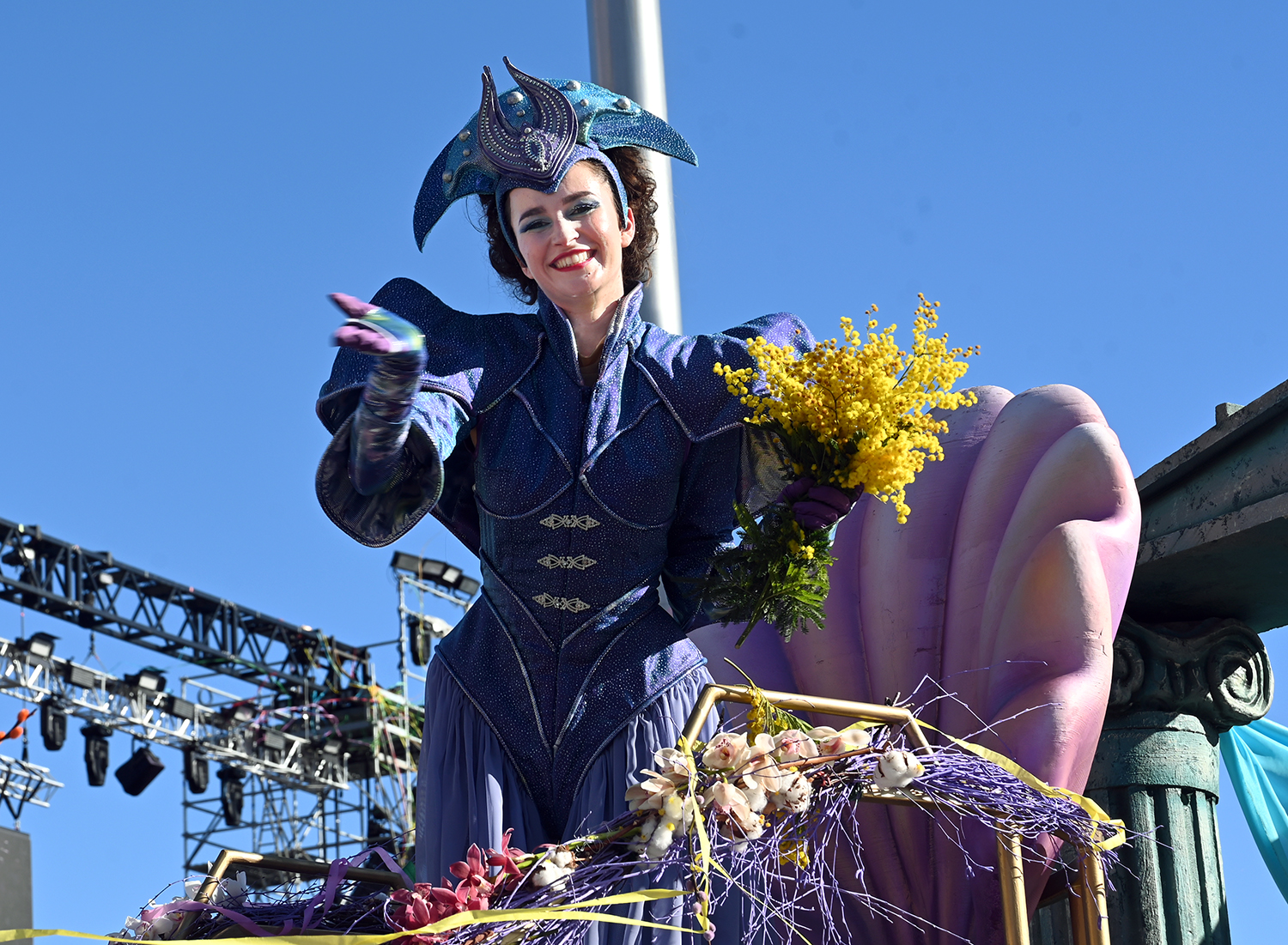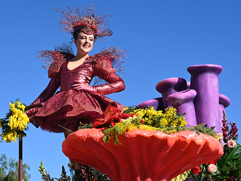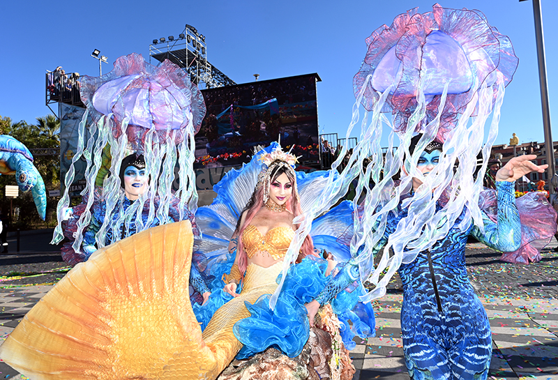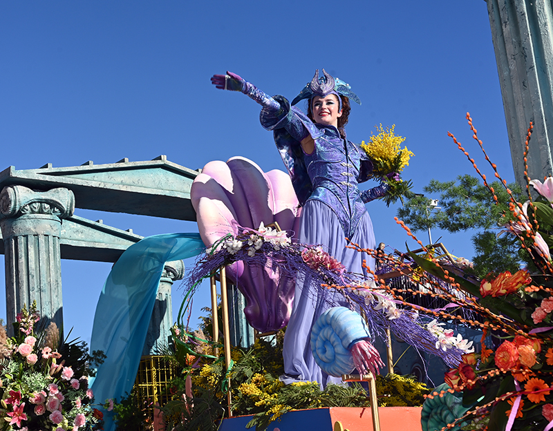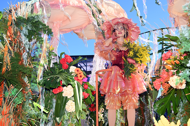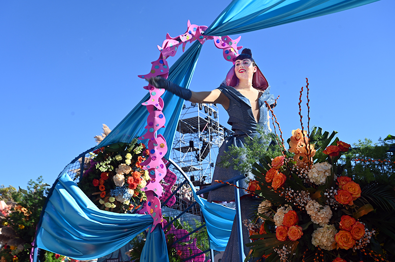 Sous Les Étoiles, Bouquet De Crevettes, Le Soleil a rendez-vous avec le Poisson Lune, Bancs de Poissons, Atlantide, Pas de Deux, Les Coraux, Plisse Soleil, Les Tendances de l’Imaginaire, Filaments, Collier de Perles, L’Univers du Dessus, Spirales Pétrifiées, Monstres Imaginaires ont composé le corso des Batailles de Fleurs. Chaque char faisant référence à la mer. Un récit d’émerveillement : dans les profondeurs azurées d’un monde englouti se cache un royaume enchanteur où la lumière du soleil danse en reflets scintillants parmi les coraux multicolores. Ces structures vivantes, aux formes fantasmagoriques, s’élevent comme des jardins irréels abritant une flore et une faune d’une richesse inouïe.