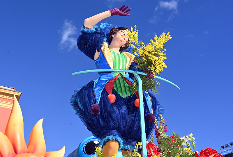 En conservant le sens du burlesque et de la fête, les rituelles Batailles de Fleurs, concentrées sur la Place Masséna, jouent toujours les stars avec de nombreux chars décorés de plus de 100 000 tiges de fleurs (glaïeuls, gerberas, marguerites, œillets, roses, lys…) et 3000 fleurs fraiches sont distribuées chaque jour au public. Du haut des chars, de gracieuses jeunes filles lancent des bouquets parfumés et ensoleillés – comme du mimosa – aux mains avides des spectateurs qui tentent de les attraper dans des cris de joie et les emportent ensuite comme des trophées rares et précieux.