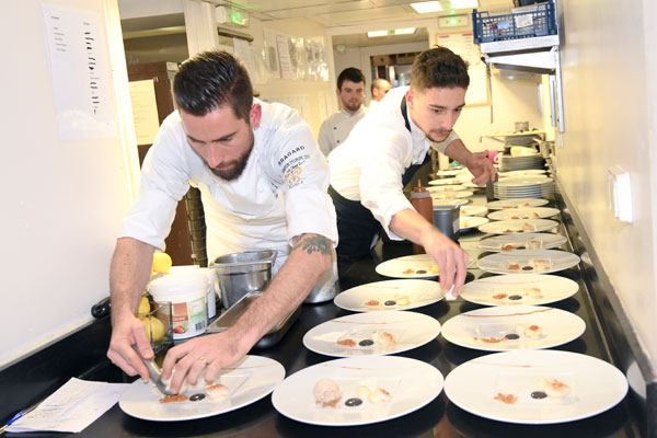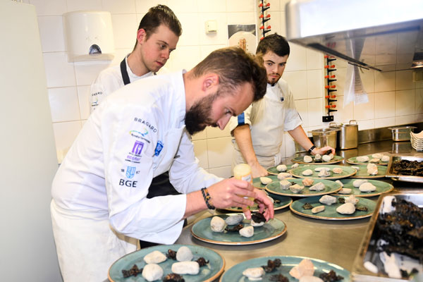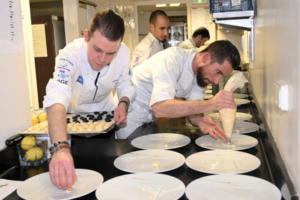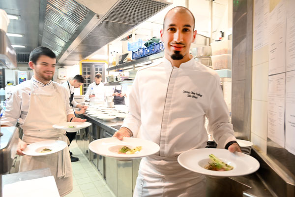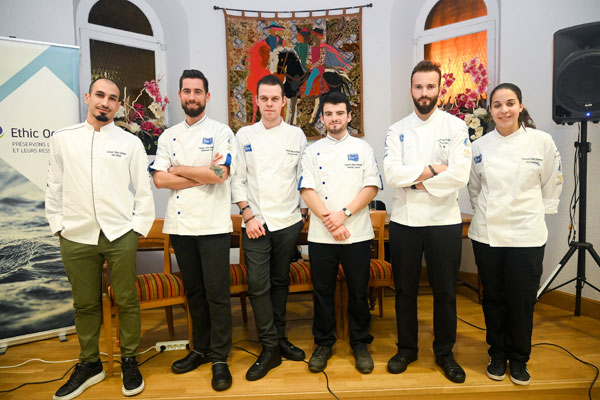 Pour s’impliquer à ses côtés, Léa Combelonge a fait appel à de jeunes chefs qui mettent leurs talents au service de la protection des océans: l’Équipage des Cuisiniers de la Mer, une brigade qui réunit les autres lauréats et finalistes du Concours Olivier Roellinger. Ces jeunes cuisiniers passionnés par leur métier sont convaincus du rôle qu’ils ont à jouer en privilégiant des espèces de poissons non surexploitées. Étaient présent à Mougins: Jérémy Coirier, Quentin Leroux, Selim M’Nasri, Sébastien Rath et son apprenti Enzo Triellato, ainsi que Terence Van Lenten, 1er prix Europe de l’Ouest et du Nord, venu de De Rooi Pannen Breda, aux Pays-Bas. Ces chefs talentueux sont devenus des ambassadeurs de la mer, des océans et de la pêche durable par leurs créations culinaires dans des assiettes responsables.