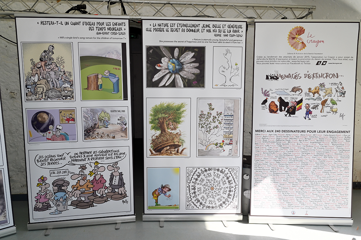 Des débats sur le dessin de presse et la liberté d’expression, des rencontres avec les dessinateurs, ont également permis au public de s’immerger dans la dure réalité des dangers auquel notre planète et les humains sont confrontés: déforestation, feux de forêts, inondations, fonte des glace, pollution marine, atmosphérique et pollution des sols, radioactivité, pétrole, océan de déchets, pêche surabondante, dégazage des pétroliers en mer, les OGM (cellule de plante génétiquement modifiée) et le scandale Monsanto, malbouffe… Toutes les grandes problématiques du XXIe siècle et les écosystèmes fragilisés par l’homme ont été croquées avec humour et talent.