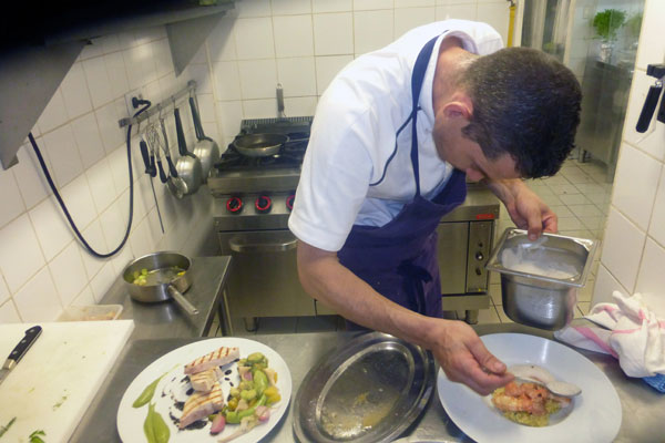 La cuisine du Restaurant l’Alchimie est une cuisine gaie, ensoleillée, élaborée avec des produits très frais du terroir, une carte postale de la Méditerranée dans l’assiette: poisson provenant d’un pêcheur de Nice, safran et fromage de chèvre de Sospel, les courgettes trompettes de Vintimille… Un moment privilégié: la cueillette des plantes poussant dans son potager ou celui de sa mère pour sublimer ses plats.