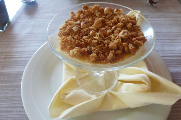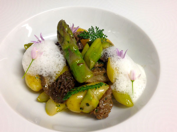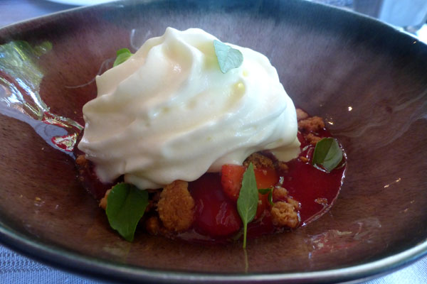 En dessert, on peut par exemple savourer une Panna Cotta Gingembre-Combawa, Crumble et Noisette du Piémont ou une Soupe de Fraises au Sureau et espuma Chocolat Blanc.