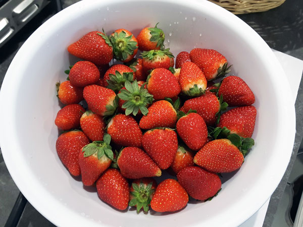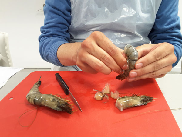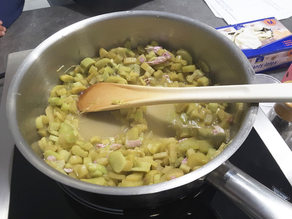 Tout s’enchaîne ensuite avec l’épluchage et l’effeuillage des artichauts violets et la préparation d’une marinade. Déshabiller les gambas de leur carapace, découper des filets de Saint Pierre – ce qui s’avère quand même très technique pour mes petites mains malhabiles. Enfin, épluchage et coupage en fines rondelles de la rhubarbe, des fraises, dressage des plats, sans oublier la pose délicate de la petite pétale rose dans l’assiette.