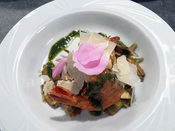 Salade d’Artichaut cru, Mariné à la Rose, Gambas poêlées et Basilic