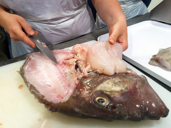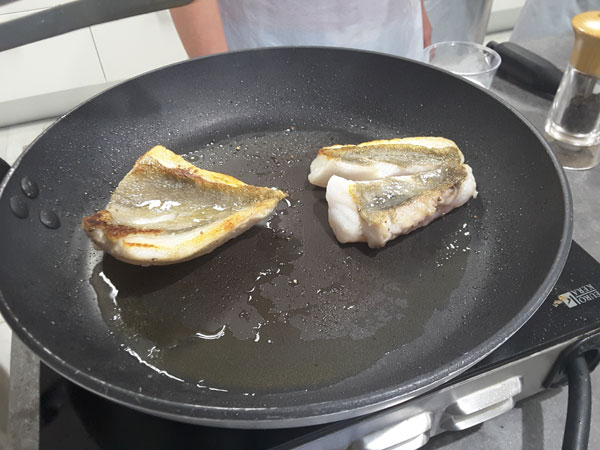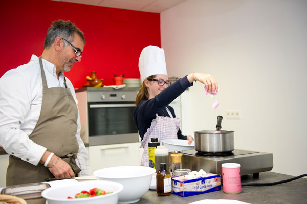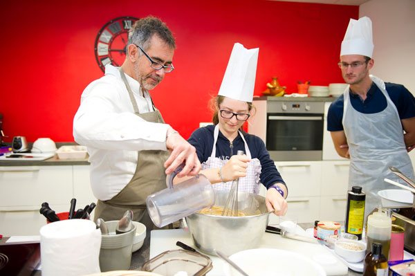 Toque sur la tête et tablier noué autour de la taille, je suis à l’écoute du chef et très vite sa méthode pédagogique me familiarise avec les produits et les techniques. Il s’instaure un échange et une ambiance conviviale entre le chef et ses élèves d’un jour. Tout en présentant les recettes que nous allons devoir préparer, le chef professeur nous transmet avec simplicité ses connaissances et son savoir-faire tout en restant à l’écoute de nos interrogations. Il nous donne des conseils sur les dosages et nous livre ses astuces. Par exemple, gagner du temps en commençant par les desserts qui demandent souvent de la cuisson et un plan de travail bien propre.