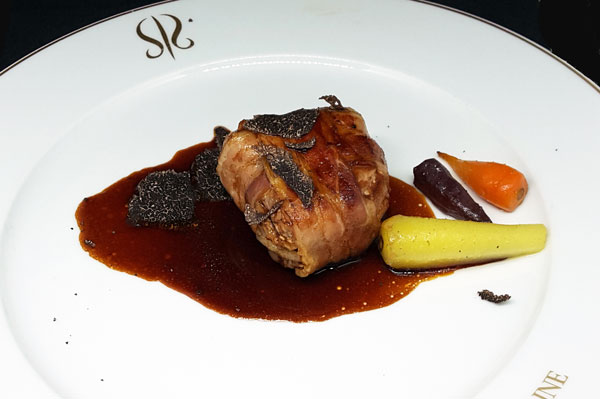 Entrée: Foie Gras à la Truffe, gelée de Tomate verte bio, petit pain brioché Un magnifique mariage du Foie Gras et de la Truffe, son compagnon traditionnel du patrimoine gourmand. Avant d’être lentement associé à la truffe par une lente cuisson à basse température, le foie gras velouté et fondant, a été poêlé pour offrir la plus belle expression de ce magnifique produit. Il acquiert ainsi une saveur unique, à laquelle la truffe ajoute l’âme parfumée de notre région. La présentation en « voilier » du plat conjuguait plaisir des pupilles et des papilles.